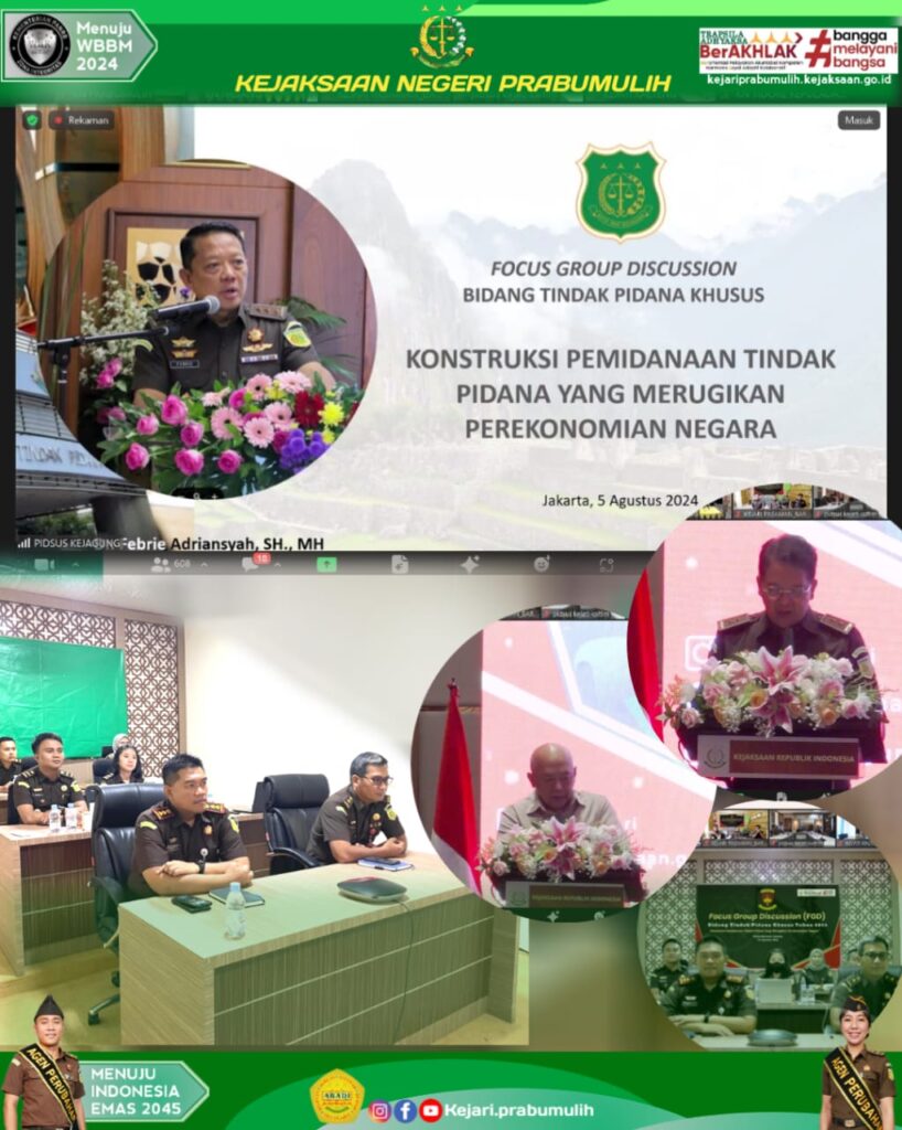 Kepala Kejaksaan Negeri Prabumulih Bapak Khristiya Lutfiasandhi, S.H., M.H. bersama Kepala Seksi Tindak Pidana Khusus Bapak Safei, S.H., M.H., dan Kasubsi Tindak Pidana Khusus beserta Staf mengikuti kegiatan FGD (Focus Group Discussion) Bidang Tindak Pidana Khusus Tahun 2024 dengan tema “Konstruksi Pemidanaan Tindak Pidana Yang Merugikan Perekonomian Negara” yang diadakan oleh Jaksa Agung Mudak Tindak Pidana Khusus secara daring.