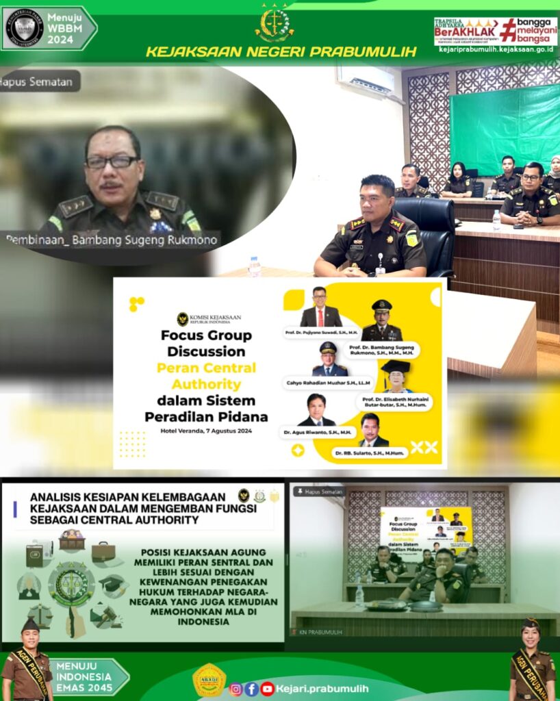 Kepala Kejaksaan Negeri Prabumulih Bapak Khristiya Lutfiasandhi, S.H., M.H. beserta dengan Kepala Seksi Tindak Pidana Umum Bapak Mirsyah Rizal, S.H., M.H., Kepala Seksi Tindak Pidana Khusus Bapak Safei, S.H., M.H., mengikuti kegiatan FGD (Focus Group Discussion) dengan tema “Peran Central Authority dalam Sistem Peradilan Pidana” yang diadakan oleh Komisi Kejaksaan Republik Indonesia secara daring melalui zoom meeting.