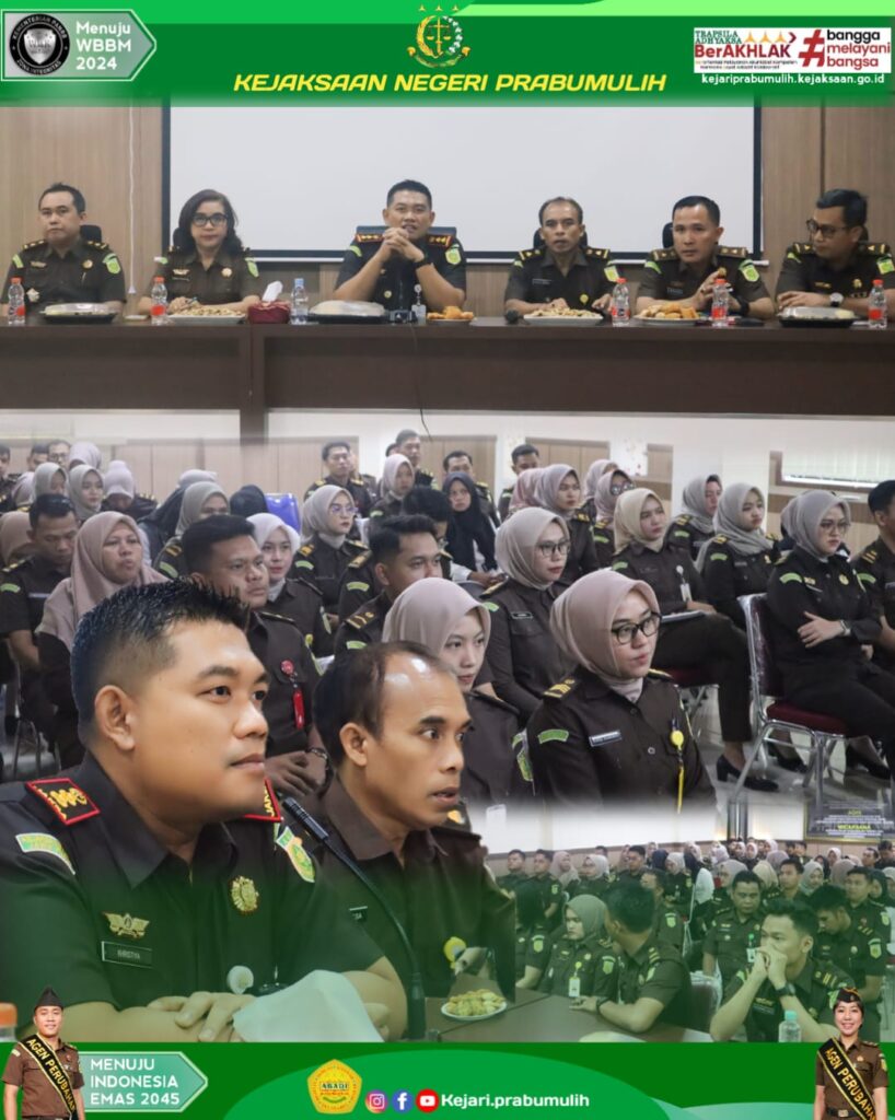 Bahwa dalam arahannya Kepala Kejaksaan Negeri Prabumulih menghibau agar seluruh pegawai dapat menjaga kekompakan dalam melaksanakan tugas sesuai dengan tupoksi masing-masing bidang serta menjaga kedisiplinan kerja dan juga meningatkan Kepada seluruh Pegawai untuk menjaga Integritas menjelang dilaksanakannya Pilkada Serentak Tahun 2024.