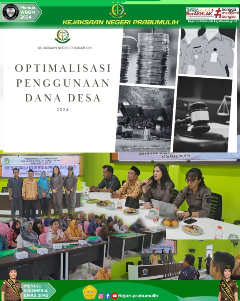 Bertempat di Aula Desa Karya Mulya Kecamatan Rambang Kapak Tengah Kota Prabumulih, Kasubsi Ekeupps Ibu Meylda Pegasari, S.H dan Plh.Kasubsi Ipolhankam Sosbudmasti Prorin & Penkum pada Seksi Intelijen menjadi Narasumber pada kegiatan Bimtek Kesadaran Hukum Tentang Pengelolaan Alokasi Dana Desa Tahap II Tahun 2024.