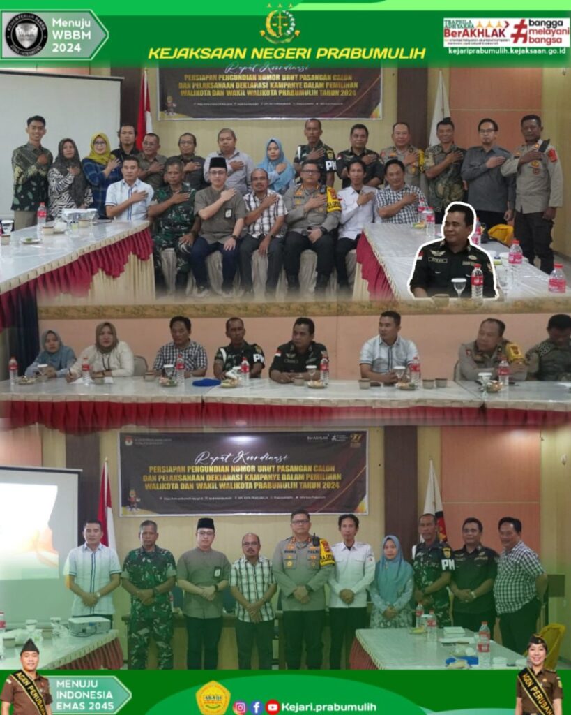 Hari Sabtu tanggal 21 September 2024 bertempat di Hotel Gran Nikita Prabumulih, Kepala Kejaksaan Negeri Prabumulih bapak Khristiya Lutfiasandhi diwakili oleh bapak Efran, S.H. mengikuti Rapat koordinasi pengundian nomor urut pasangan calon dan pelaksanaan deklarasi kampanye dalam pemilihan Walikota dan Wakil Walikota Prabumulih tahun 2024 yang dilaksanakan oleh KPU kota Prabumulih