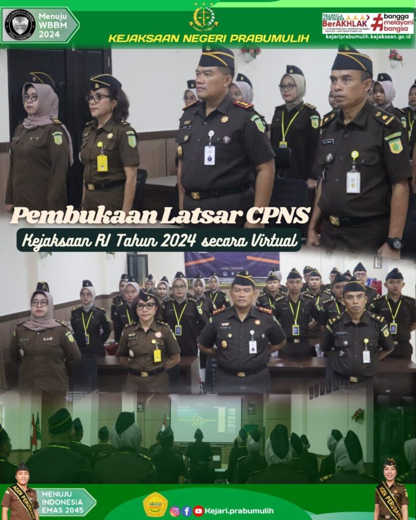 Hari Rabu tanggal 16 Oktober 2024 bertempat di Aula Kejaksaan Negeri Prabumulih, Kepala Kejaksaan Negeri Prabumulih bapak Khristiya Lutfiasandhi, S.H., M.H. Beserta para Kasi / Kasubag, Kaur dan Peserta Latsar mengikuti Pembukaan Pelatihan Dasar Calon Pegawai Negeri Sipil Golongan III dan Golongan II Tahun 2024 secara Virtual.
