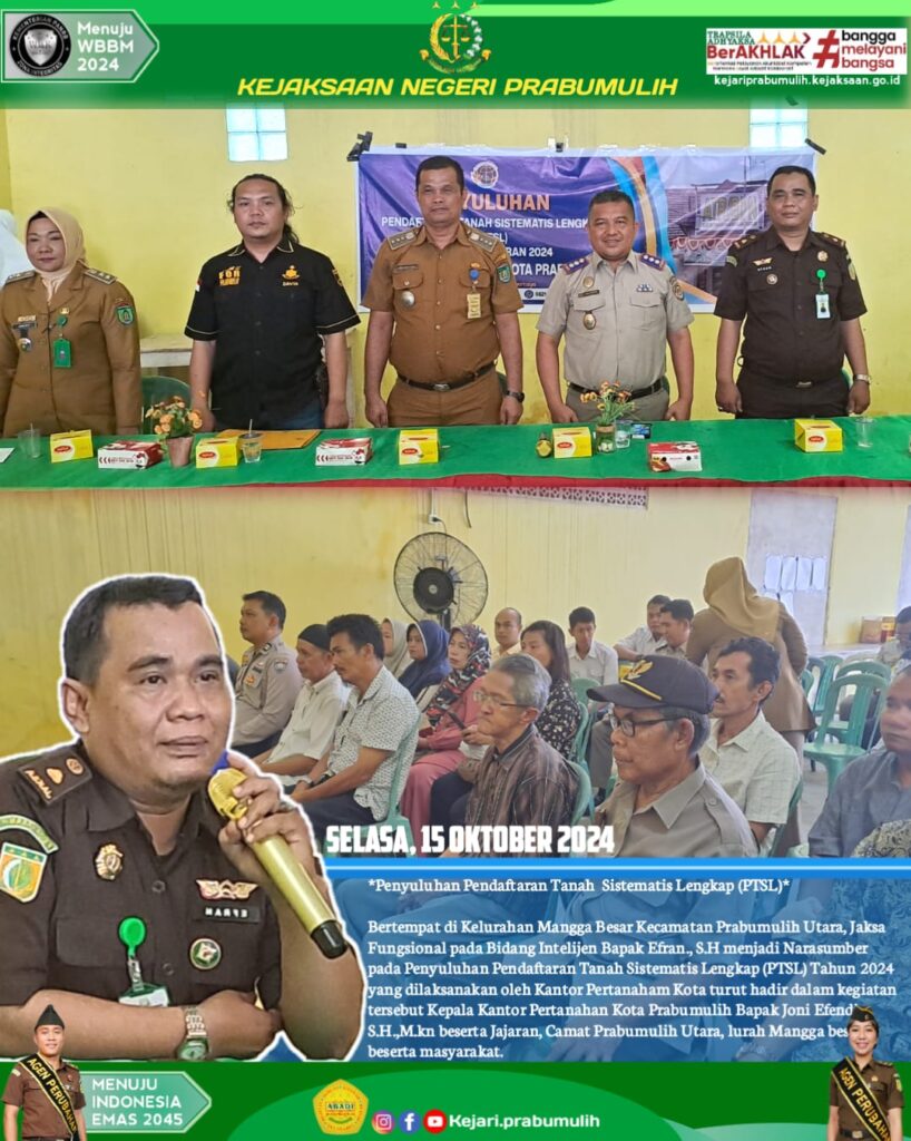 Bertempat di Kelurahan Mangga Besar Kecamatan Prabumulih Utara, Jaksa Fungsional pada Bidang Intelijen Bapak Efran., S.H menjadi Narasumber pada Penyuluhan Pendaftaran Tanah Sistematis Lengkap (PTSL) Tahun 2024 yang dilaksanakan oleh Kantor Pertanahan Kota turut hadir dalam kegiatan tersebut Kepala Kantor Pertanahan Kota Prabumulih Bapak Joni Efendi, S.H.,M.kn beserta Jajaran, Camat Prabumulih Utara, lurah Mangga besar beserta masyarakat.