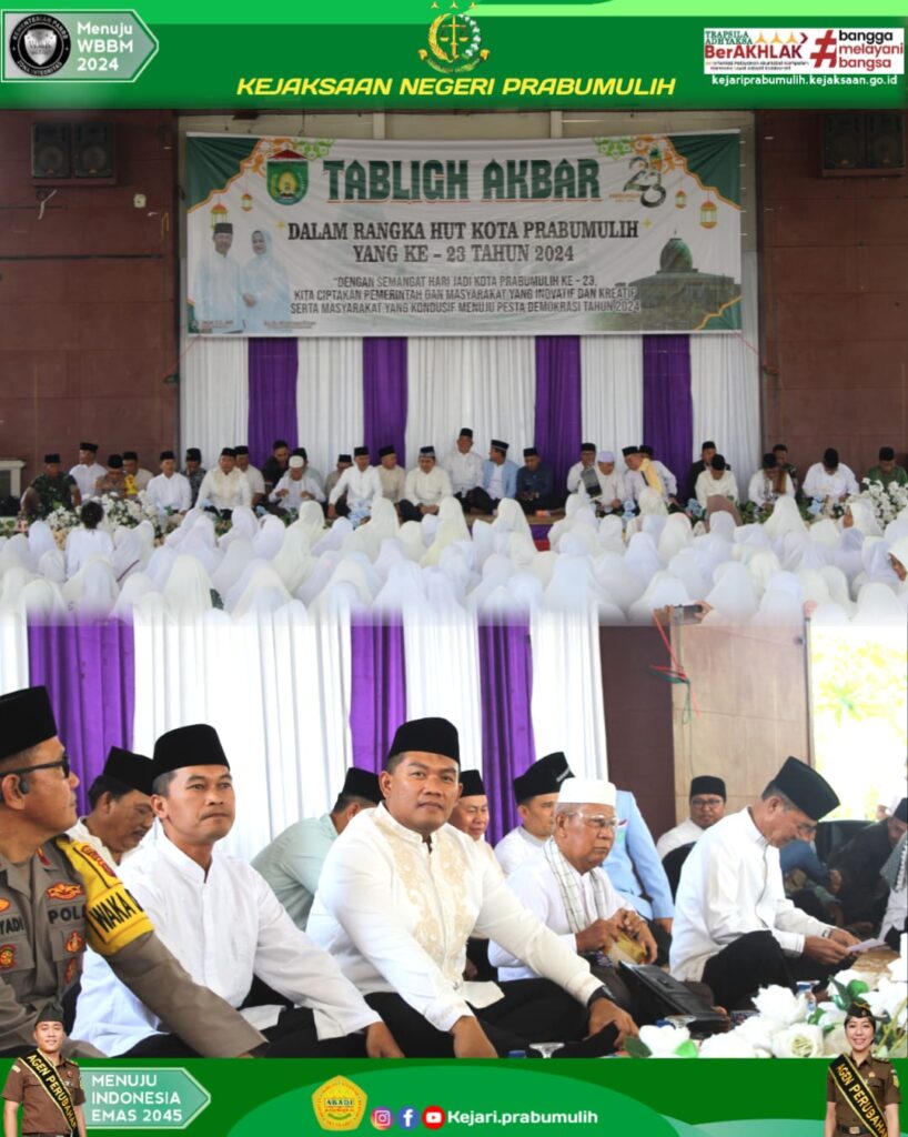 Bertempat di Pendopoan Rumah Dinas Walikota Prabumulih, Kepala Kejaksaan Negeri Prabumulih Bapak Khristiya Lutfiasandhi,S.H.,M.H dan Ketua IAD Daerah Prabumulih Ny.Lis Khristiya menghadiri Tabligh Akbar Dalam Rangka Memperingati Hari Ulang Tahun Kota Prabumulih Ke-23 Tahun 2024.