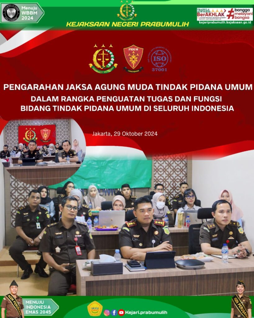 Kepala Kejaksaan Negeri Prabumulih Bapak Khristiya Lutfiasandhi, S.H.,M.H bersama Kepala Seksi Tindak Pidana Umum Bapak Mirsyah Rizal, S.H.,M.H,dan Kepala Seksi Tindak Pidana Khusus Bapak Safe’i, S.H.,M.H dan Jaksa Fungsional pada Kejaksaan Negeri Prabumulih mengikut Pengarahan Jaksa Agung Tindak Pidana Umum Dalam Rangka Penguatan Tugas dan Fungsi Bidang Tindak Pidana Umum di Seluruh Indonesia secara daring lewat Zoom Meeting.