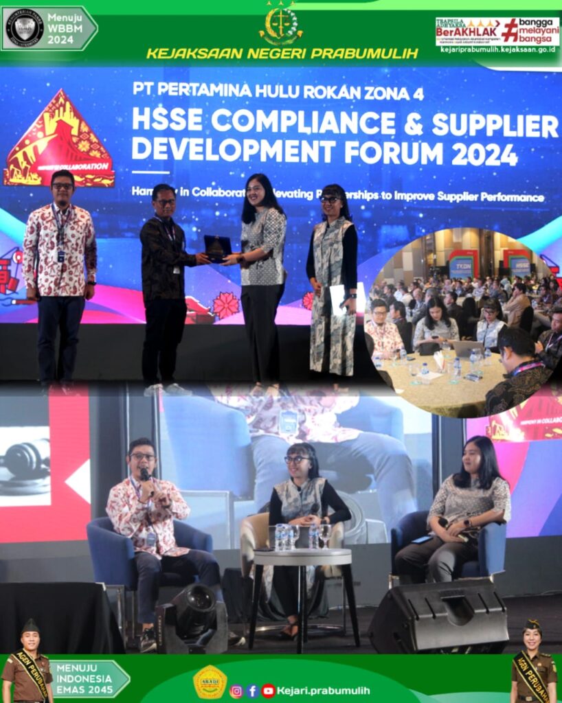 Bertempat di Ballroom Hotel Arista Kota Palembang Kepala Kejaksaan Negeri Prabumulih Bapak Khristiya Lutfiasandhi,S.H. M.H yang diwakili Kasubsi Ekeupps Ibu Meylda Pegasari,S.H dan Plh.Kasubsi Ipoledsosbudhankam Ibu Intan Magdalena,S.H menjadi Narasumber dalam Acara HSSE COMPLIENCE & SUPPLIER DEVELOPMENT FORUM 2024 yg dilaksanakan Oleh PT.Pertamina Hulu Rokan Zona 4 Prabumulih.