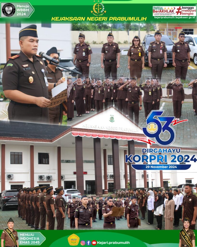 Bertindak Sebagai Inspektur Upacara Kepala Kejaksaan Negeri Prabumulih Bapak Khristiya Lutfiasandhi,S.H.,M.H bersama seluruh Kepala Seksi,Kasubagbin dan Pegawai pada Kejaksaan Negeri Prabumulih melakukan Upacara Dalam Rangka Memperingati HUT KORPRI Ke-53 Tahun 2024.