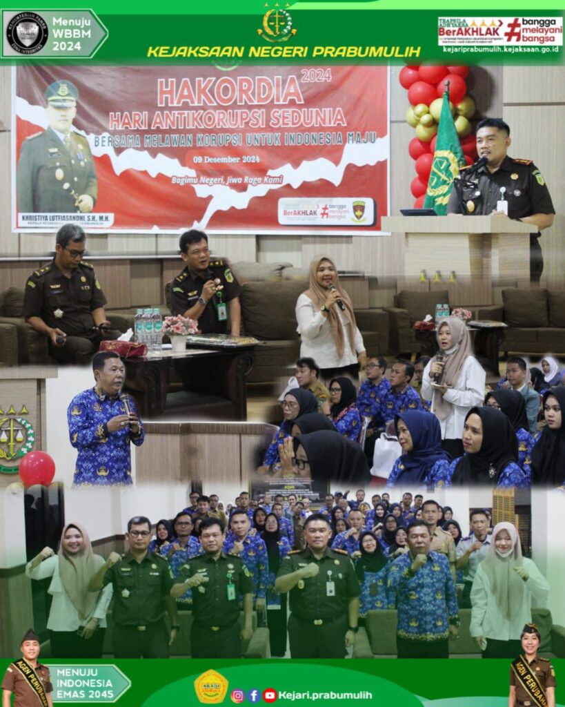 Dalam rangka memperingati Hari Anti Korupsi Sedunia (HAKORDIA) Tahun 2024, Kepala Kejaksaan Negeri Prabumulih bapak Khristiya Lutfiasandhi, S.H., M.H. Beserta Para Kasi, Kasubsi, dan Jaksa Fungsional mengadakan kegiatan Seminar Memperingati Hari Anti Korupsi Sedunia serta Penyerahan Hadiah Pemenang Kompetensi Penulisan Artikel dengan tema “TEGUHKAN KOMITMEN BERANTAS KORUPSI UNTUK INDONESIA MAJU” yang di adakan di Aula Kejaksaan Negeri Prabumulih.