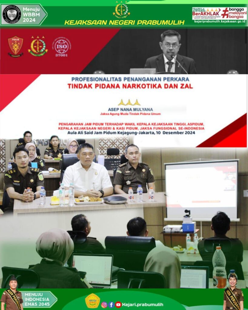 Hari Selasa tanggal 10 Desember 2024 bertempat di Ruang Siaran Pers Kejaksaan Negeri Prabumulih, Kepala Kejaksaan Negeri Prabumulih bapak Khristiya Lutfiasandhi, S.H., M.H. didamping oleh Plh. Kepala Seksi Tindak Pidana Umum bapak Faisyal Basni, S.H., M.H. beserta Kasubsi dan Jaksa Fungsional mengikuti Pengarahan Bapak Jaksa Agung Muda Tindak Pidana Umum terkait Penguatan Penanganan Perkara Tindak Pidana Narkotika secara virtual
