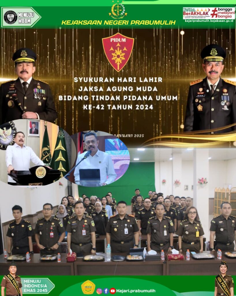 Bertempat di Aula Kantor Kejaksaan Negeri Prabumulih, Kepala Kejaksaan Negeri Prabumulih Bapak Khristiya Lutfiasandhi,S.H.,M.H bersama seluruh Kepala Seksi dan Kasubagbin serta seluruh Pegawai pada Kejaksaan Negeri Prabumulih mengikuti syukuran hari lahir Jaksa Agung Muda Tindak Pidana Umum yg ke-42 tahun 2024 secara Virtual melalui Zoom Metting.