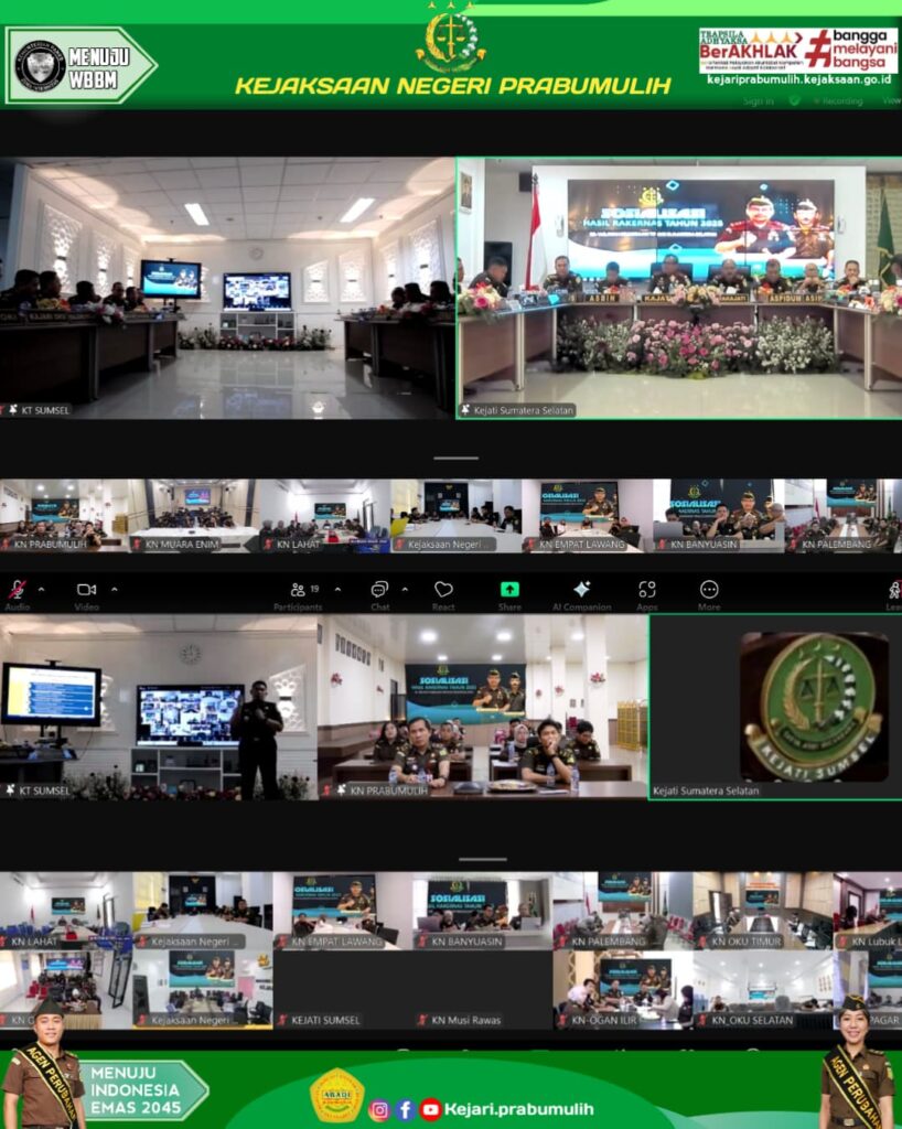 Bertempat di Aula Kantor Kejaksaan Negeri Prabumulih Plh.Kepala Kejaksaan Negeri Prabumulih Bapak Mirsyah Rizal,S.H.,M.H bersama seluruh pegawai pada Kejaksaan Negeri Prabumulih mengikuti Sosialisasi Hasil Rakernas Tahun 2025 se-wilayah Kejaksaan Tinggi Sumatera Selatan secara dari melalui Zoom Meeting.