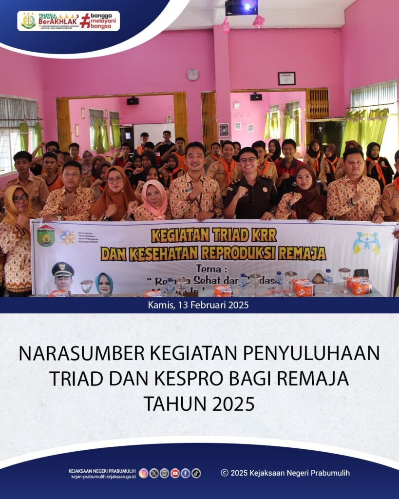 Bertempat di SMK Pratiwi Kota Prabumulih, Jaksa Fungsional pada Bidang Intelijen Bapak Hendro HS, S.H menjadi Narasumber pada Kegiatan Orientasi/Pelatihan Teknis Pelaksana/Kader Ketahanan dan Kesejahteraan Keluarga (BKB,BKR,BKL,PPKS,PIK-R dan UPPKA) tentang Penyuluhan TRIAD dan Kesehatan Reproduksi bagi Remaja Tahun 2025.