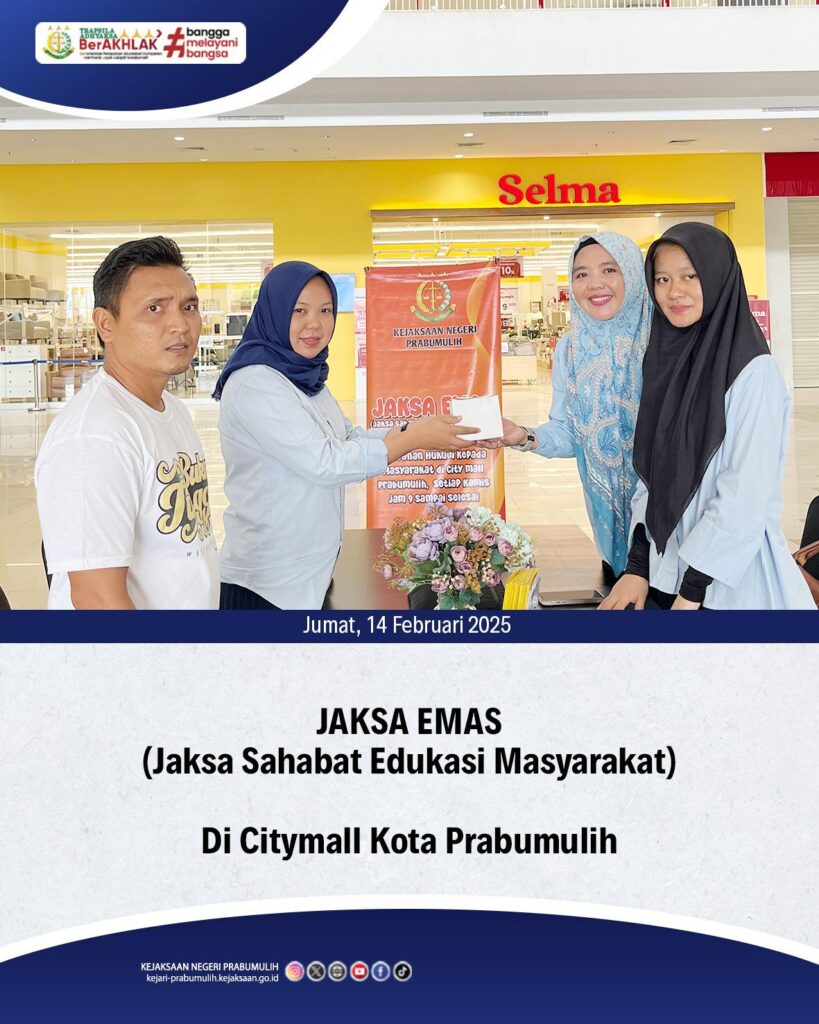 Bertempat di Citimall Kota Prabumulih, Jaksa Pengacara Negara (JPN) pada Kejaksaan Negeri Prabumulih melaksanakan kegiatan JAKSA EMAS (Jaksa Sahabat Edukasi Masyarakat).