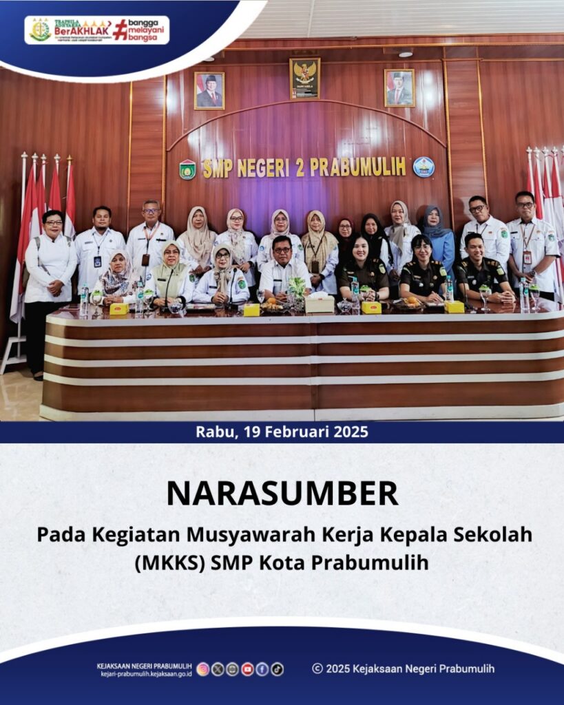 Bertempat di Aula SMP Negeri 2 Kota Prabumulih, Kasubsi II Bidang Intelijen Ibu Meylda Pegasari,S.H dan Plh.Kasubsi I Bidang Intelijen Ibu Intan Magdalena S.H menjadi Narasumber pada kegiatan Musyawarah Kerja Kepala Sekolah (MKKS) SMP Kota Prabumulih Tahun 2025.