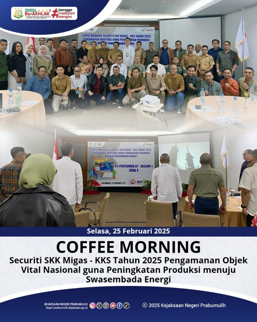 Bertempat di Counselor Room Novotel Palembang, Kepala Kejaksaan Negeri Prabumulih Bapak Khristiya Lutfiasandhi,S.H.,M.H. mengikuti Coffee Morning Securiti SKK Migas – KKS tahun 2025 pengamanan Obvitnas guna peningkatan produksi menuju swasembada energi yang diselenggarakan oleh PT. Pertamina EP Region 1 Zona 4