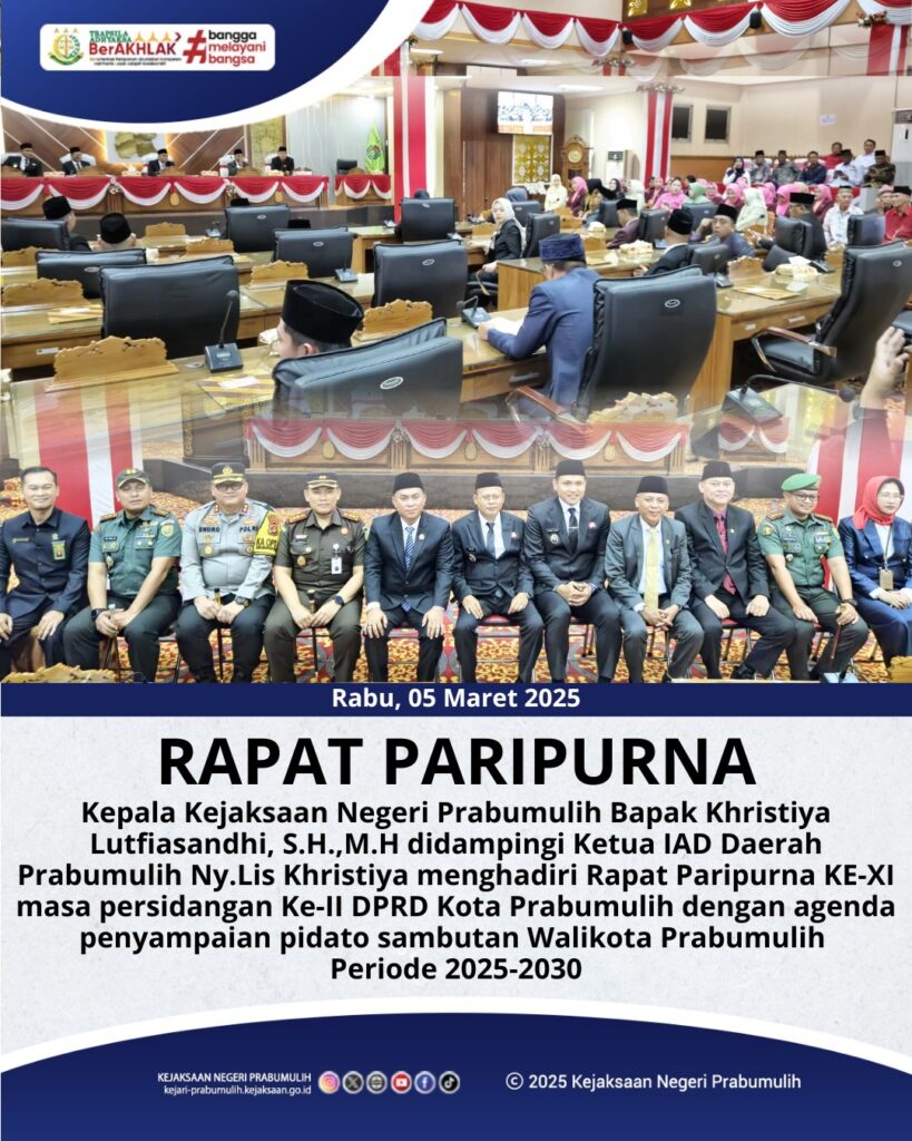 Bertempat di Ruang Rapat Paripurna DPRD Kota Prabumulih, Kepala Kejaksaan Negeri Prabumulih Bapak Khristiya Lutfiasandhi,S.H.,M.H didampingi Ketua IAD Daerah Prabumulih Ny.Lis Khristiya menghadiri Rapat Paripurna KE-XI masa persidangan Ke-II DPRD Kota Prabumulih yang dipimpin oleh Ketua DPRD Prabumulih Bapak Deni Victoria,S.H.,M.Si dengan agenda penyampaian pidato sambutan Walikota Prabumulih Periode 2025-2030.