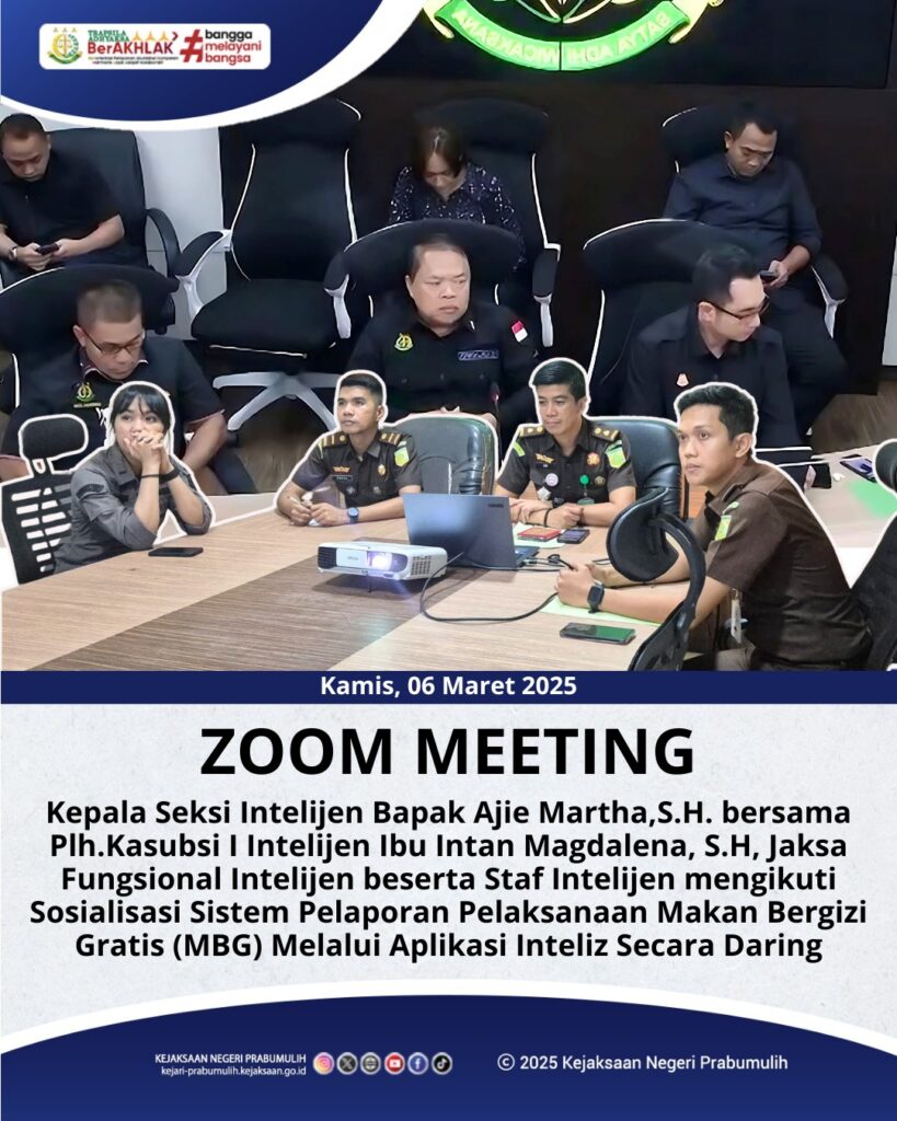 Bertempat di ruang media center Kejari Prabumulih, Kepala Seksi Intelijen Bapak Ajie Martha,S.H bersama Plh.Kasubsi I Intelijen, Jaksa Fungsional Intelijen Bapak Rozza Syaputra,S.H beserta Staf mengikuti Sosialisasi sistem Pelaporan Pelaksanaan Makan Bergizi Gratis (MBG) secara daring melalui Zoom Meeting