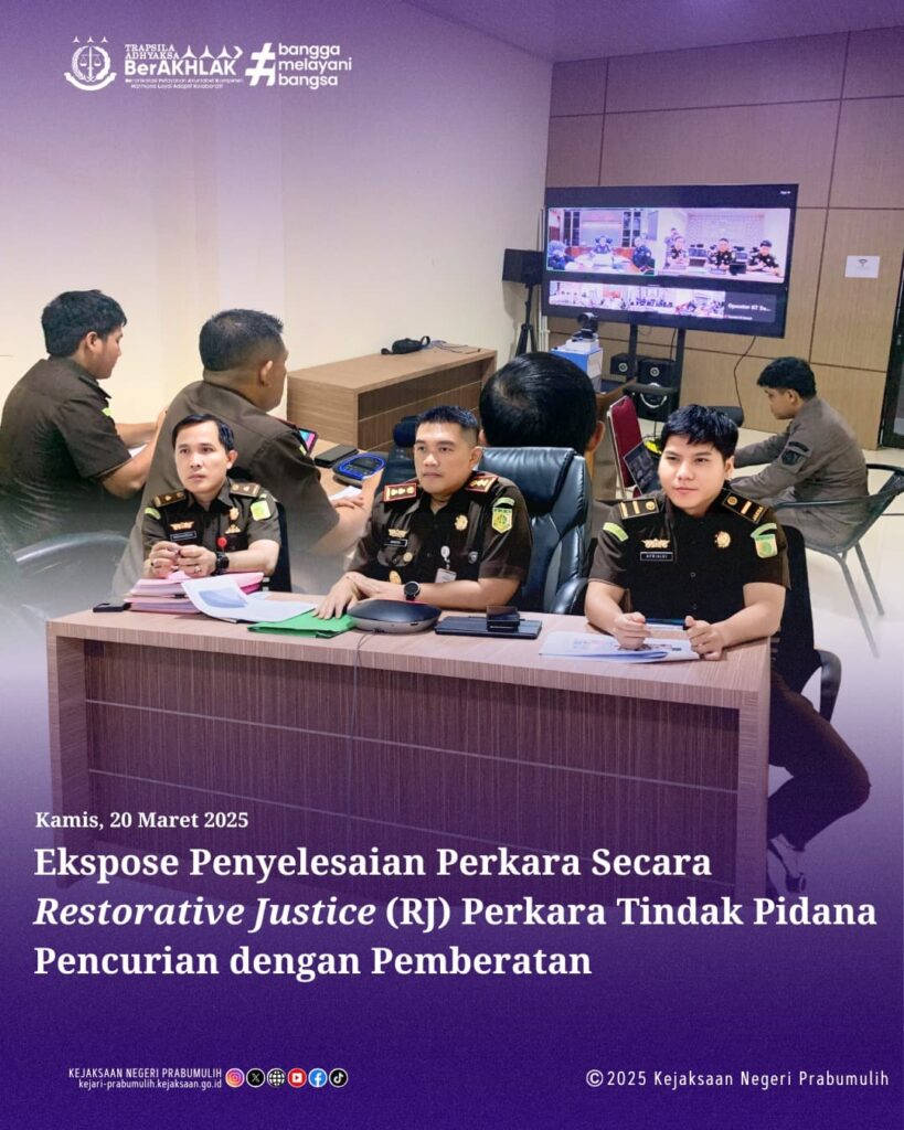 Kepala Kejaksaan Negeri Prabumulih Bapak Khristiya Lutfiasandhi,S.H.,M.H. bersama Kepala Seksi Tindak Pidana Umum Bapak Mirsyah Rizal,S.H.,M.H. dan Jaksa Fasilitator Bapak Afrialdi,S.H. melakukan Ekspose penyelesaian perkara secara Restorative Justice (RJ) Perkara Tindak Pidana Pencurian dengan Pemberatan secara Virtual melalui Zoom Meeting.