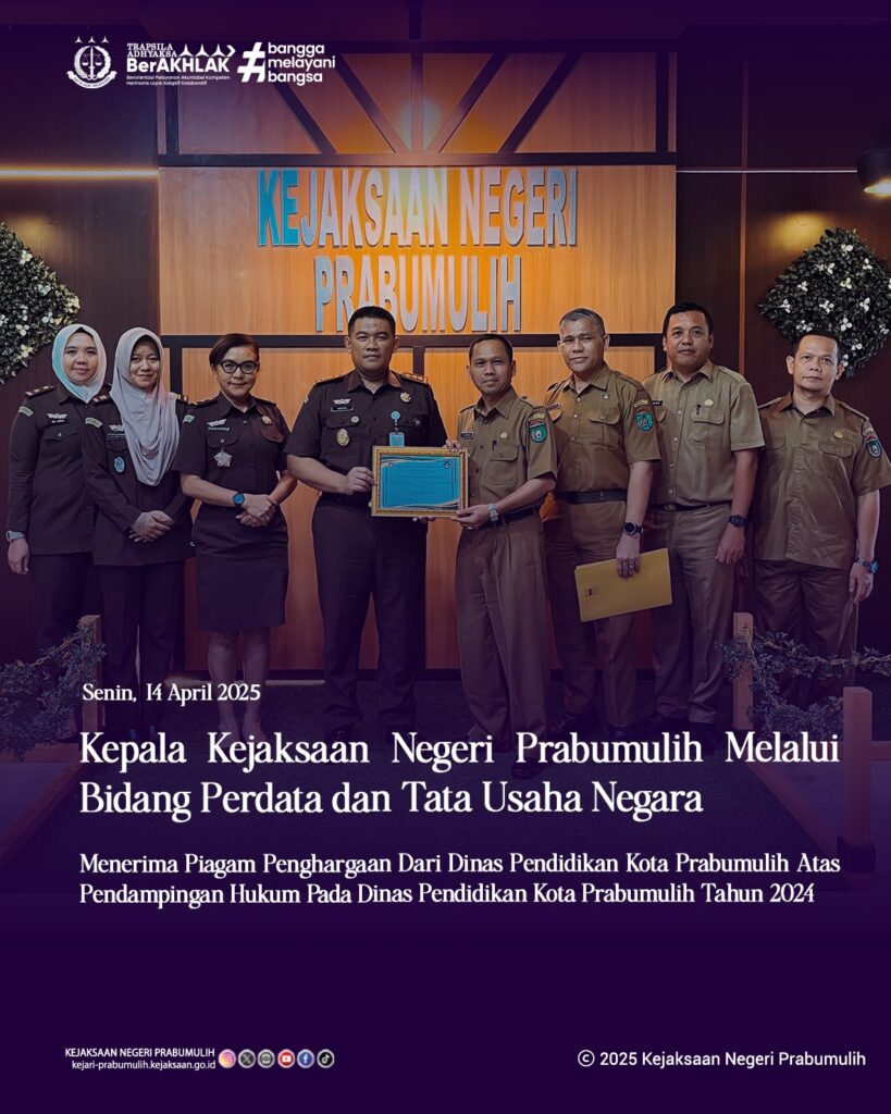 Kepala Kejaksaan Negeri Prabumulih melalui Bidang Perdata dan Tata Usaha Negara Telah Menerima Piagam Penghargaan dari Dinas Pendidikan Kota Prabumulih atas Pendampingan Hukum Bidang Perdata dan Tata Usaha Negara Pada Dinas Pendidikan Kota Prabumulih