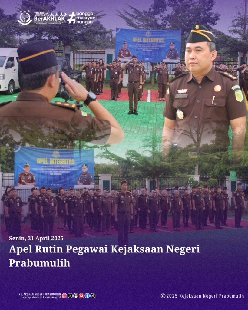 Bertempat di Halaman Kantor Kejaksaan Negeri Prabumulih, Kepala Seksi PAPBB Bapak Faisyal Basni, S.H.,M.H., memimpin Apel Rutin Senin Pagi yang diikuti oleh para Kasi dan Pegawai di lingkungan Kejaksaan Negeri Prabumulih.