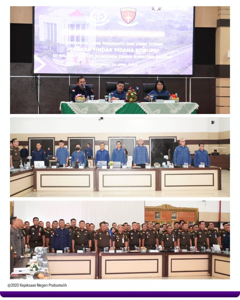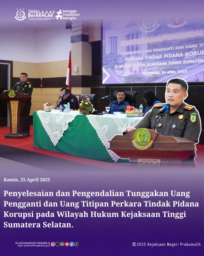 Kepala Kejaksaan Negeri Prabumulih Bapak Khristiya Lutfiasandhi, S.H.,M.H. bersama Kepala Seksi Pidana Khusus Bapak Safe’i, S.H.,M.H. Kepala Seksi Pemulihan Aset dan Pengelola Barang Bukti Bapak Faisyal Basni, S.H.,M.H. dan Bendahara PNBP Bapak Sugito, S.H. Menghadiri Acara Penyelesaian/Pengendalian Uang Titipan dan Uang Pengganti Perkara Tindak Pidana Korupsi di Wilayah Hukum Kejaksaan Tinggi Sumatera Selatan bertempat di Aula Lt 9 Kejaksaan Tinggi Sumatera Selatan di Palembang.