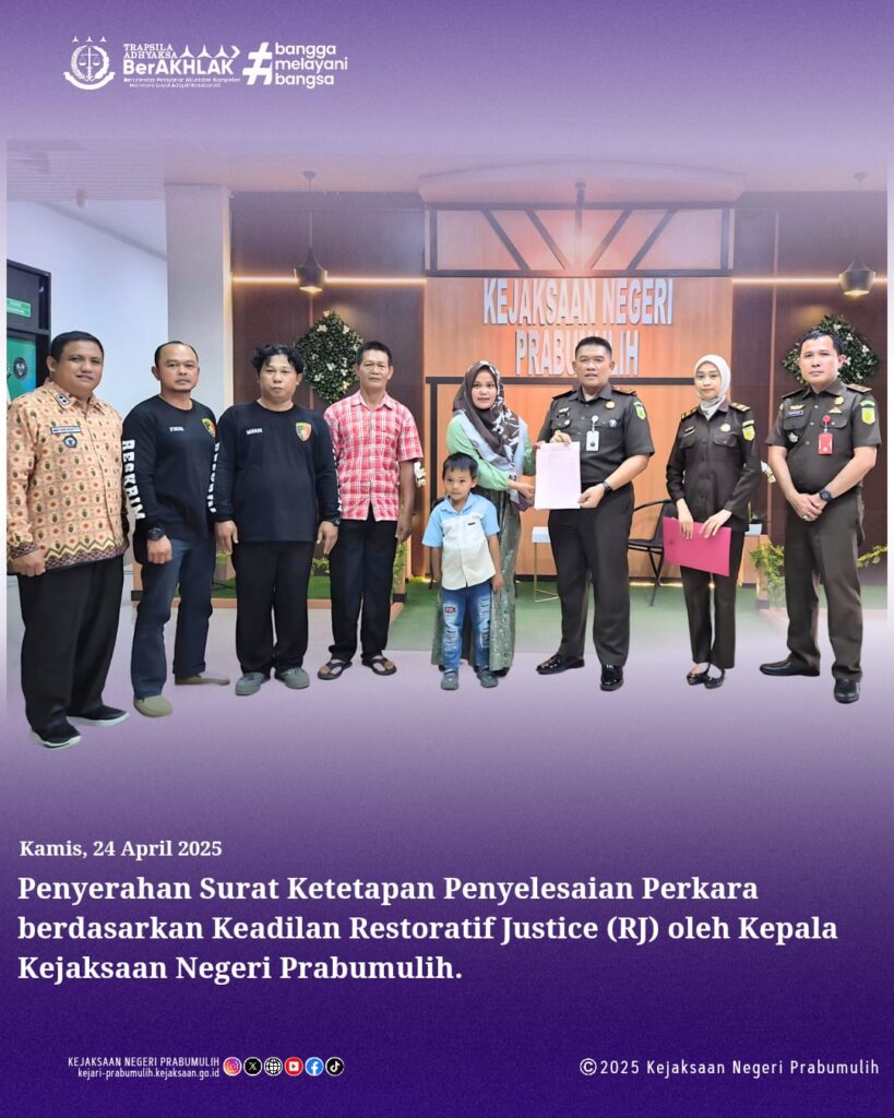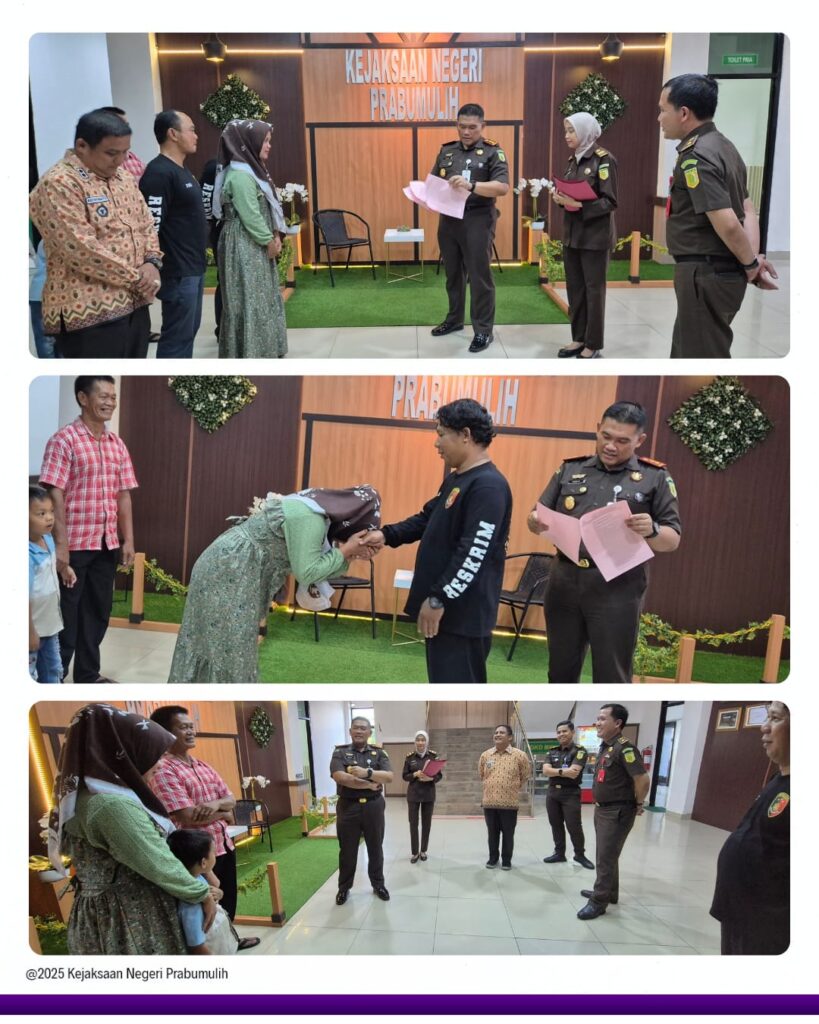Penyerahan Surat Ketetapan Penyelesaian Perkara Berdasarkan Keadilan Restoratif oleh Kepala Kejaksaan Negeri Prabumulih Bapak Khristiya Lutfiasandhi, S.H.,M.H. kepada Tersangka DA.Penyerahan disaksikan langsung oleh korban dan keluarga tersangka.