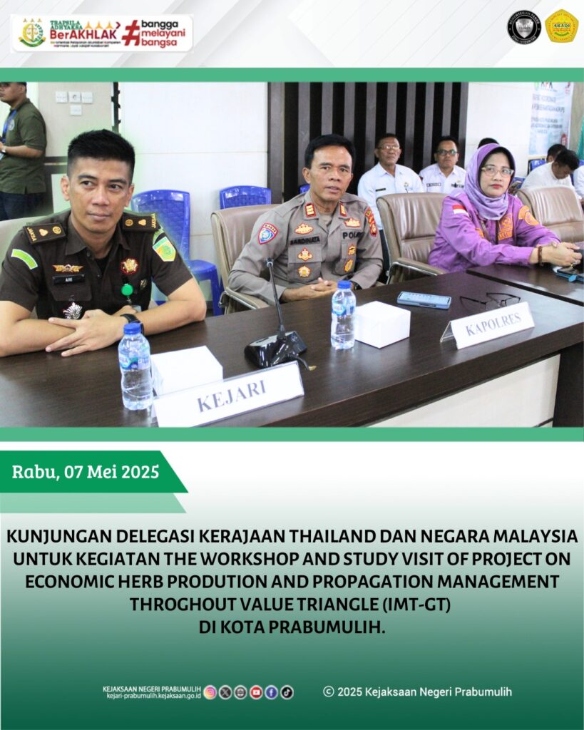 Bertempat di Ruang Rapat Lt.1 Kantor Pemerintah Kota Prabumulih, Kepala Seksi Intelijen Bapak Ajie Martha, S.H., menghadiri Penyambutan Kunjungan dari Delegasi Kerajaan Thailand dan Negara Malaysia untuk Kegiatan The Workshop and Study Visit Of Project on Economic Herb Prodution and Propagation Management Throghout Value Triangle (IMT-GT) di Kota Prabumulih.