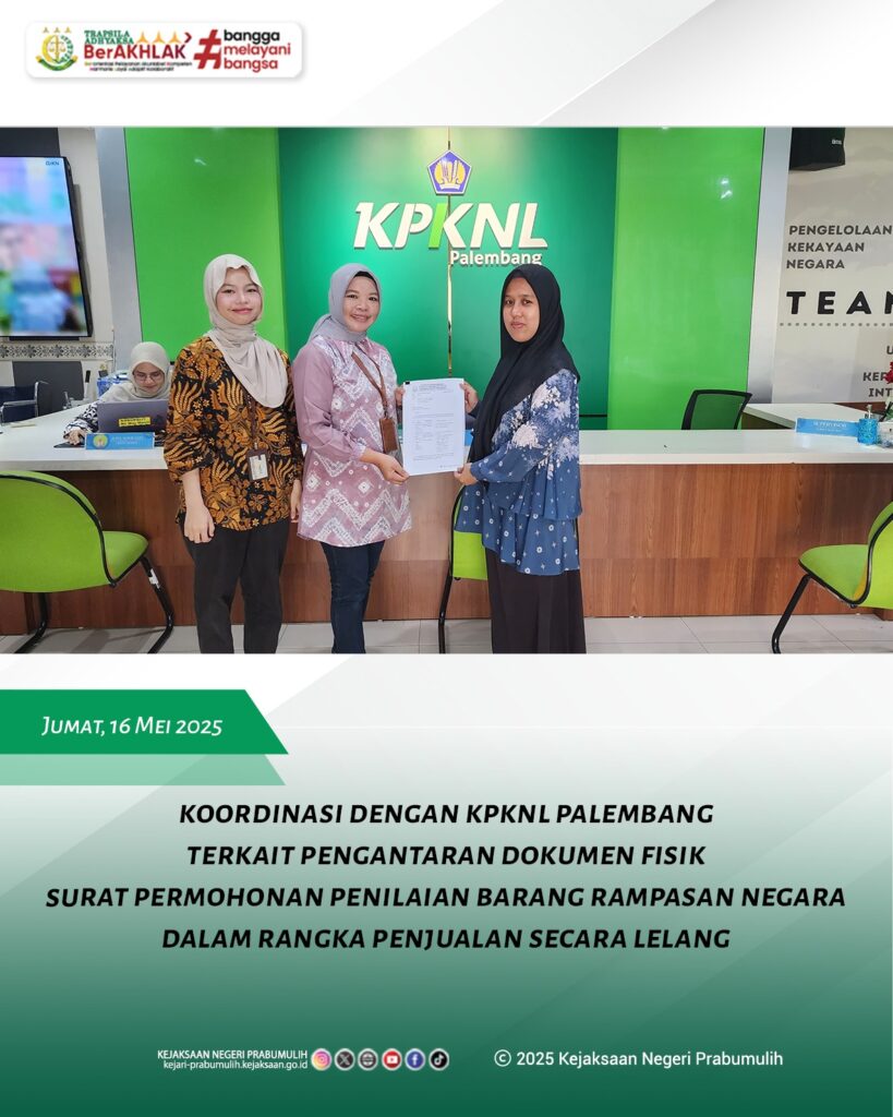 Kejari Prabumulih pada Bidang Pemulihan Aset dan Pengelolaan Barang Bukti (PAPBB) melaksanakan kegiatan koordinasi dengan KPKNL Palembang terkait pengantaran dokumen fisik Surat Permohonan Penilaian Barang Rampasan Negara.