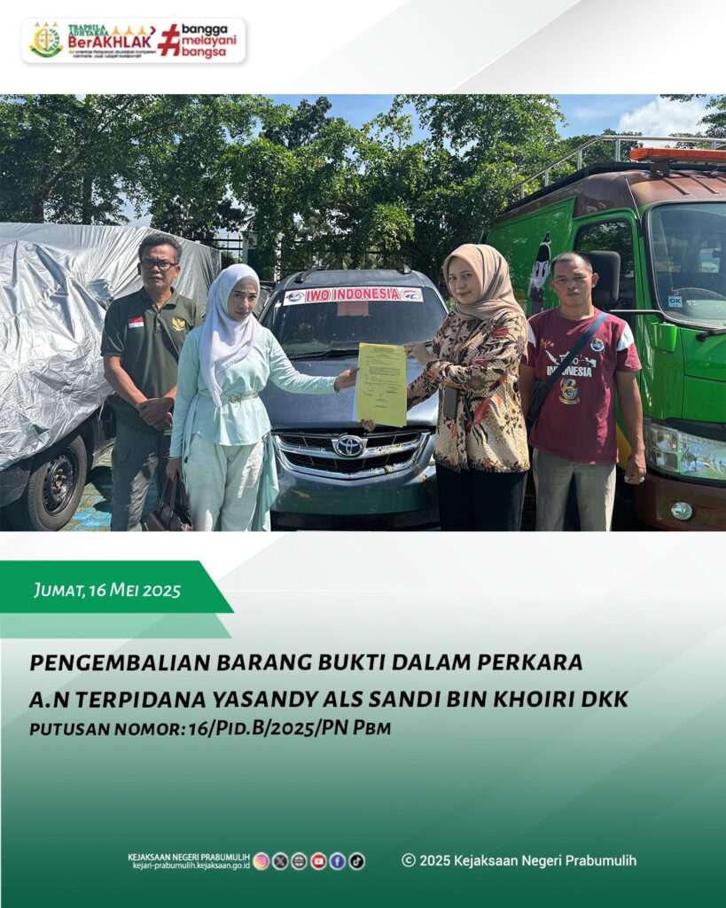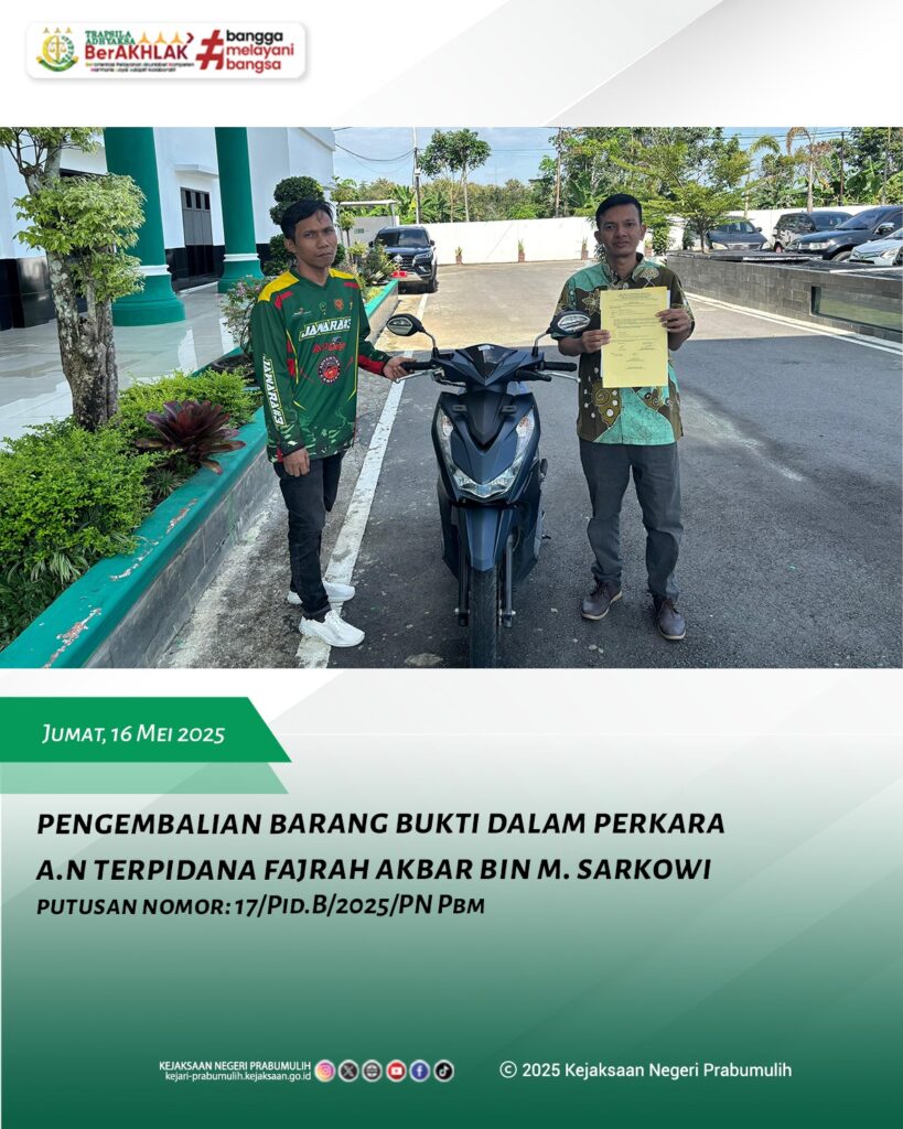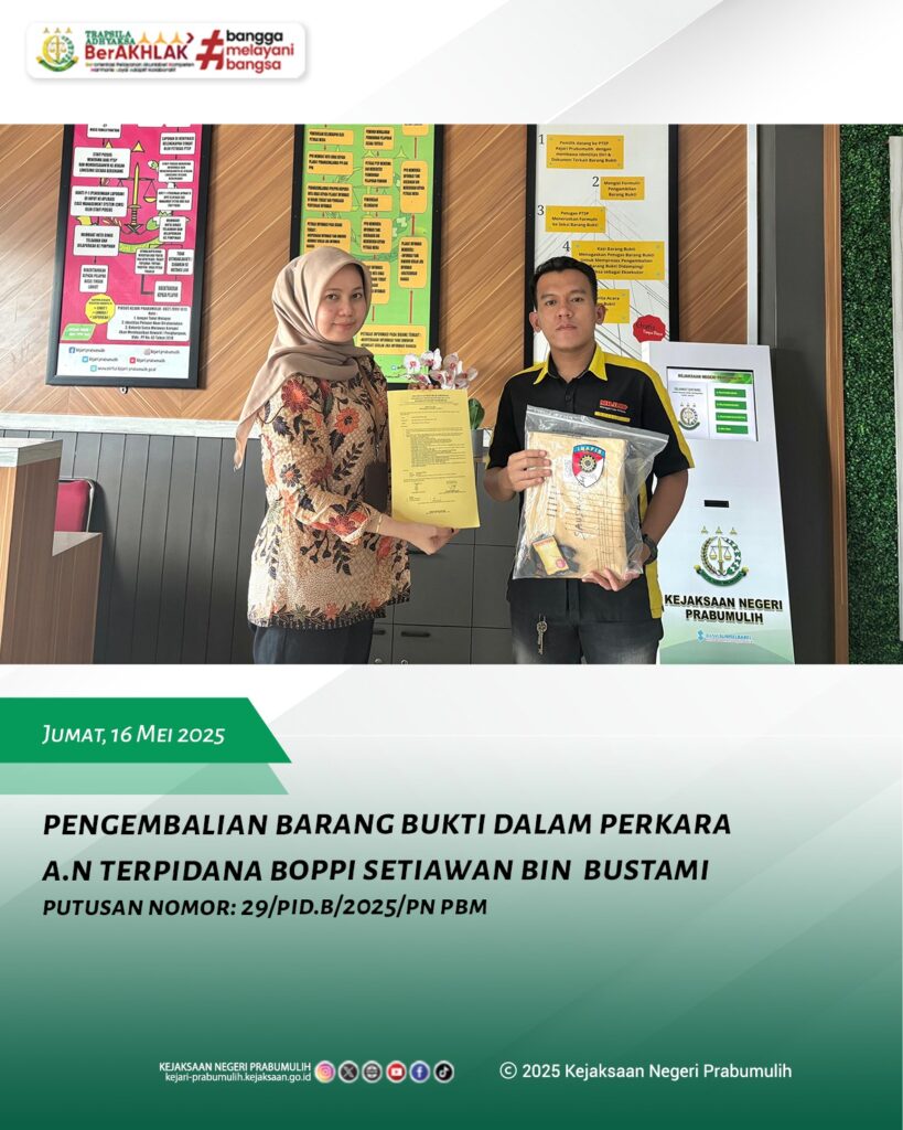 Kejari Prabumulih pada Bidang Pemulihan Aset dan Pengelolaan Barang bukti (PAPBB) telah melaksanakan Pengembalian Barang Bukti berdasarkan: