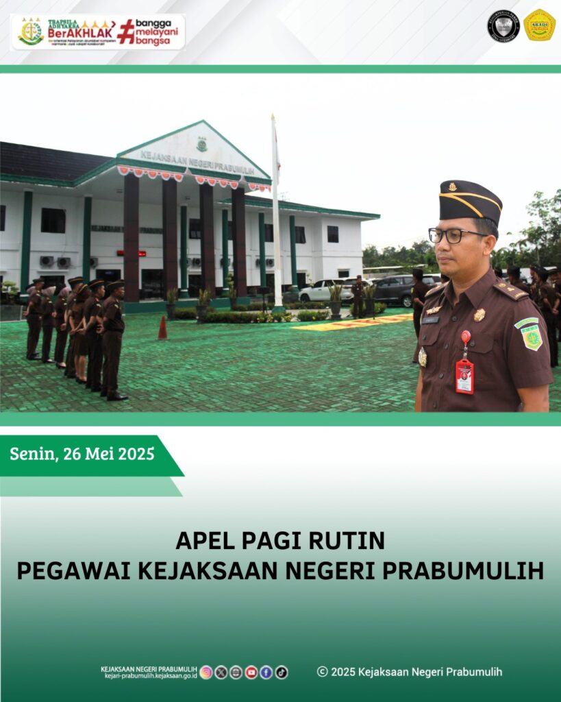 Bertempat di halaman Kantor Kejaksaan Negeri Prabumulih, Kepala Seksi Tindak Pidana Khusus Bapak Safe’i, S.H.,M.H., memimpin Apel Rutin Senin Pagi yang diikuti oleh Para Kasi dan Pegawai di lingkungan Kejaksaan Negeri Prabumulih.