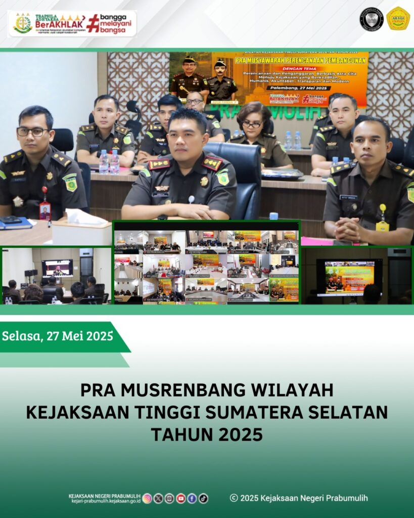 Kepala Kejaksaan Negeri Prabumulih Bapak Khristiya Lurfiasandhi, S.H.,M.H., bersama Para Kepala Seksi dan Kasubagbin pada Kejaksaan Negeri Prabumulih mengikuti Pra Musrenbang Wilayah Kejaksaan Tinggi Sumatera Selatan secara daring melalui Zoom Meeting.