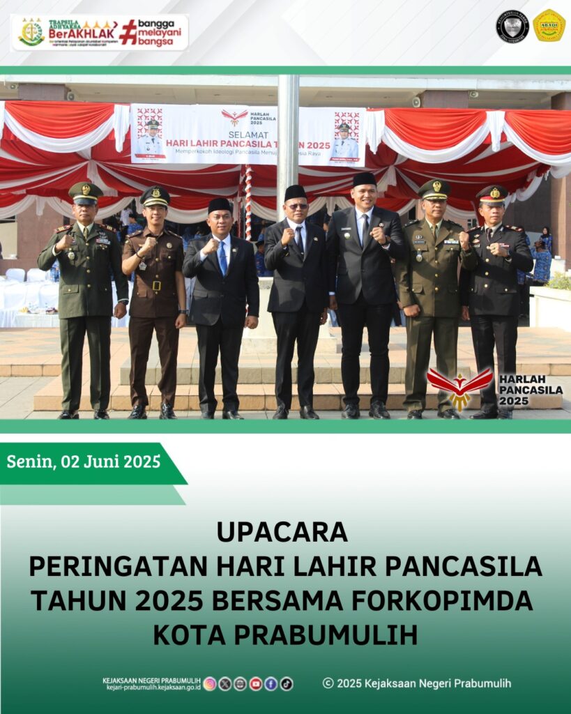 Bertempat dihalaman kantor Pemerintah Kota Prabumulih, Kepala Kejaksaan Negeri Prabumulih yang diwakili Kepala Seksi Intelijen Bapak Ajie Martha, S.H., bersama Forkopimda Kota Prabumulih mengikuti Upacara Peringatan Hari Lahir Pancasila Tahun 2025.