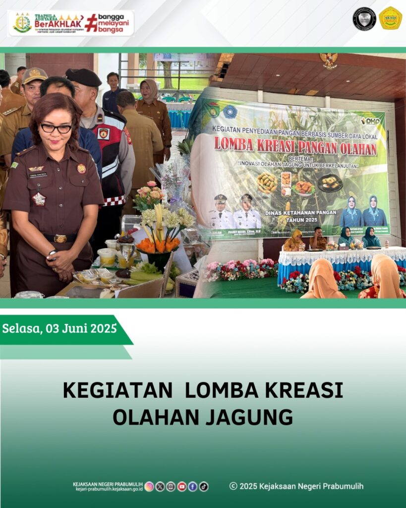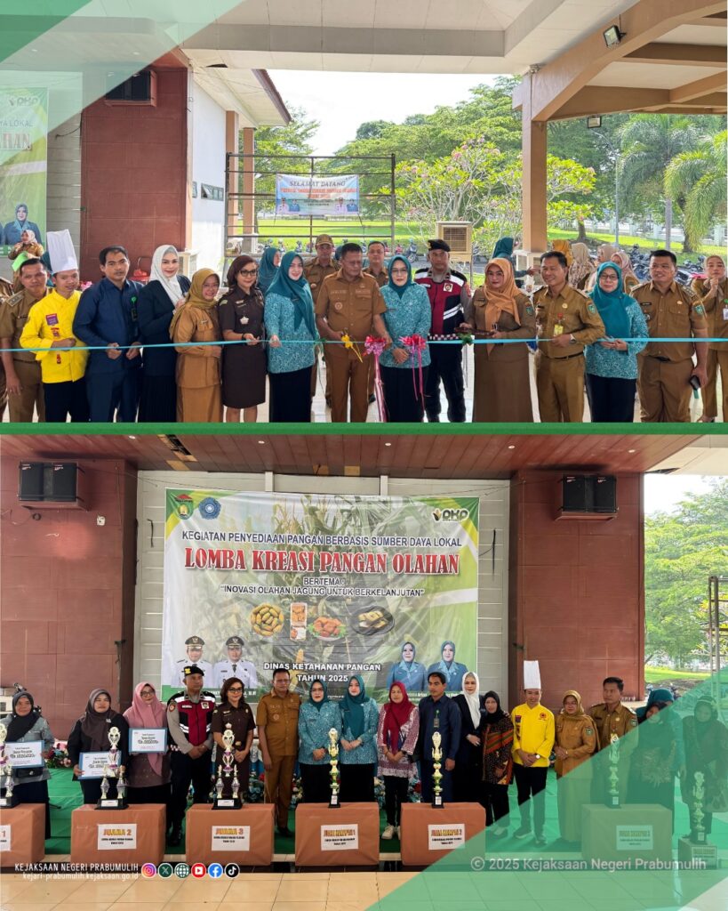 Bertempat di Pendopoan Rumah Dinas Walikota Prabumulih, Kepala Seksi Perdata dan Tata Usaha Negara ibu Erwina Mea Dimatnusa, S.H.,M.H., menghadiri Kegiatan Penyediaan Pangan Berbasis Sumber Daya Lokal Lomba Kreasi Pangan Olahan yang bertema “Inovasi Olahan Jagung untuk Berkelanjutan” yang dilaksanakan oleh Dimas Ketahanan Pangan Kota Prabumulih.