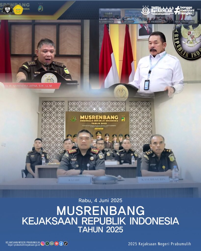 Kepala Kejaksaan Negeri Prabumulih, Bapak Khristiya Lutfiasandhi, S.H.,M.H., bersama Para Kepala Seksi dan Kasubagbin mengikuti pembukaan Musrenbang Kejaksaan Republik Indonesia Tahun 2025 yang mengusung tema “Perencanaan dan Penganggaran Berbasis Asta Cita : Menuju Kejaksaan yang Berkeadilan, Humanis, Akuntabel, Transparan dan Modern”.