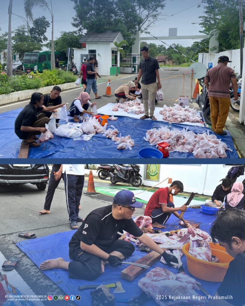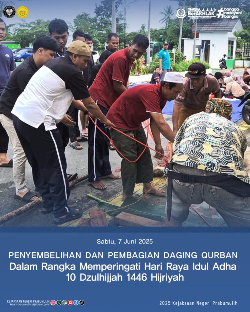 Dalam rangka Memperingati Hari Raya Idul Adha 10 Dzulhijjah 1446 Hijriyah, Kejaksaan Negeri Prabumulih telah melakukan Penyembelihan dan Pembagian Daging Qurban yang dilaksanakan di halaman Kantor Kejaksaan Negeri Prabumulih.