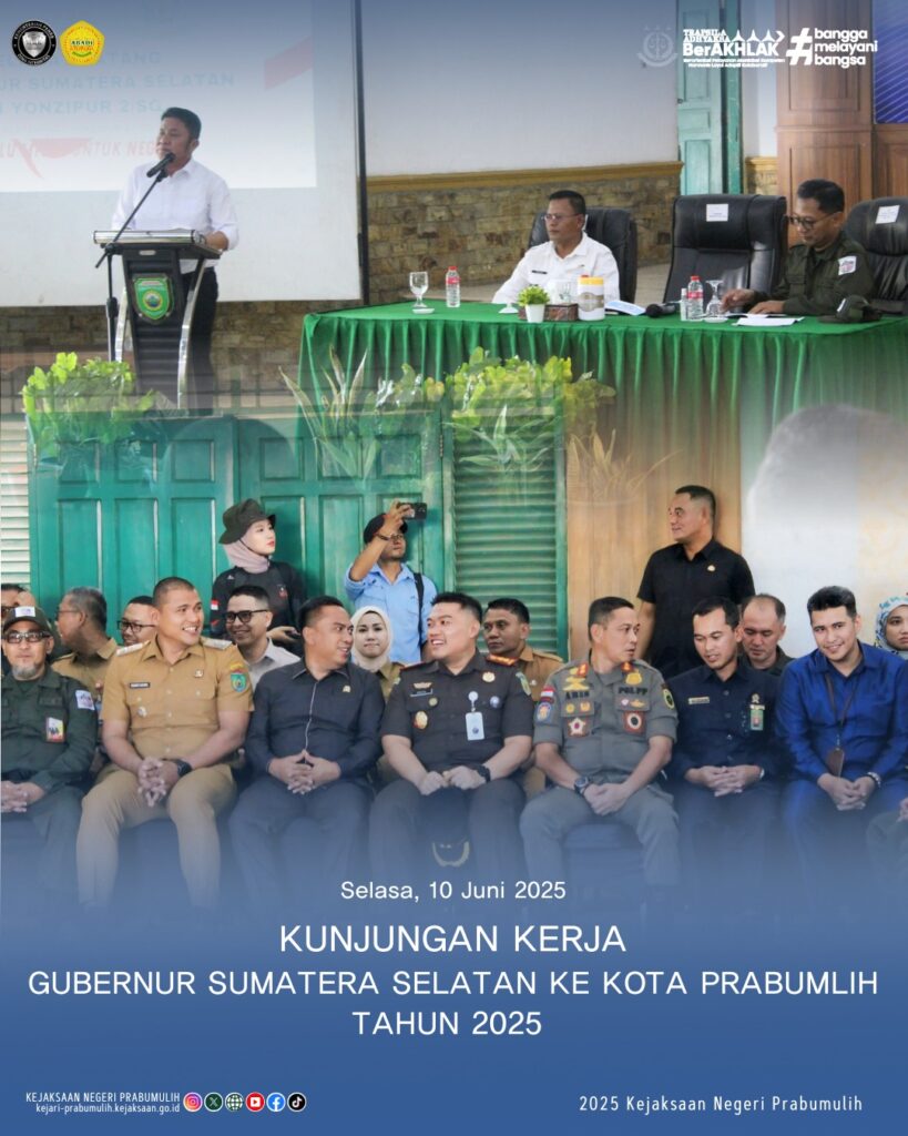 Kepala Kejaksaan Negeri Prabumulih Bapak Khristiya Litfiasandhi, S.H.,M.H., bersama Forkopimda Kota Prabumulih menyambut serta mendampingi Gubernur Sumatera Selatan Bapak H.Herman Deru beserta Jajaran di lingkup Pemerintah Provinsi Sumatera Selatan dalam Rangka Kunjungan Kerja Gubernur Sumatera Selatan di Kota Prabumulih Tahun 2025.