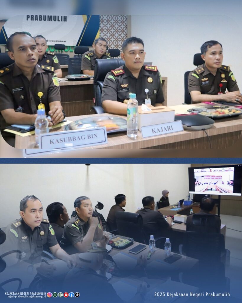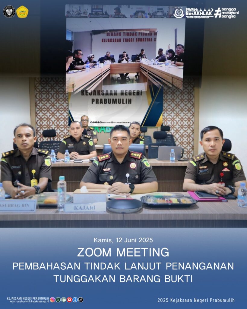 Kepala Kejaksaan Negeri Prabumulih Bapak Khristiya Lutfiasandhi, S.H.,M.H., bersama Kepala Sub Bagian Pembinaan Bapak I.K Wirasa, S.H., Kepala Seksi Tindak Pidana Umum Bapak Mirsyah Rizal, S.H.,M.H., dan Kepala Seksi PAPBB Bapak Faisyal Basni, S.H.,M.H., beserta jajaran mengikuti kegiatan Zoom Meeting terkait Pembahasan Tindak Lanjut Penanganan Tunggakan Barang Bukti bersama Plt.Asisten Pengawasan pada Kejaksaan Tinggi Sumatera Selatan Bpk. Zainul Arifin,S.H., MH., Asisten Tindak Pidana Umum Kejaksaan Tinggi Sumatera Selatan Bpk. Wahyudi, S.H., M.H., dan Plt.Asisten Pemulihan Aset Kejaksaan Tinggi Sumatera Selatan.