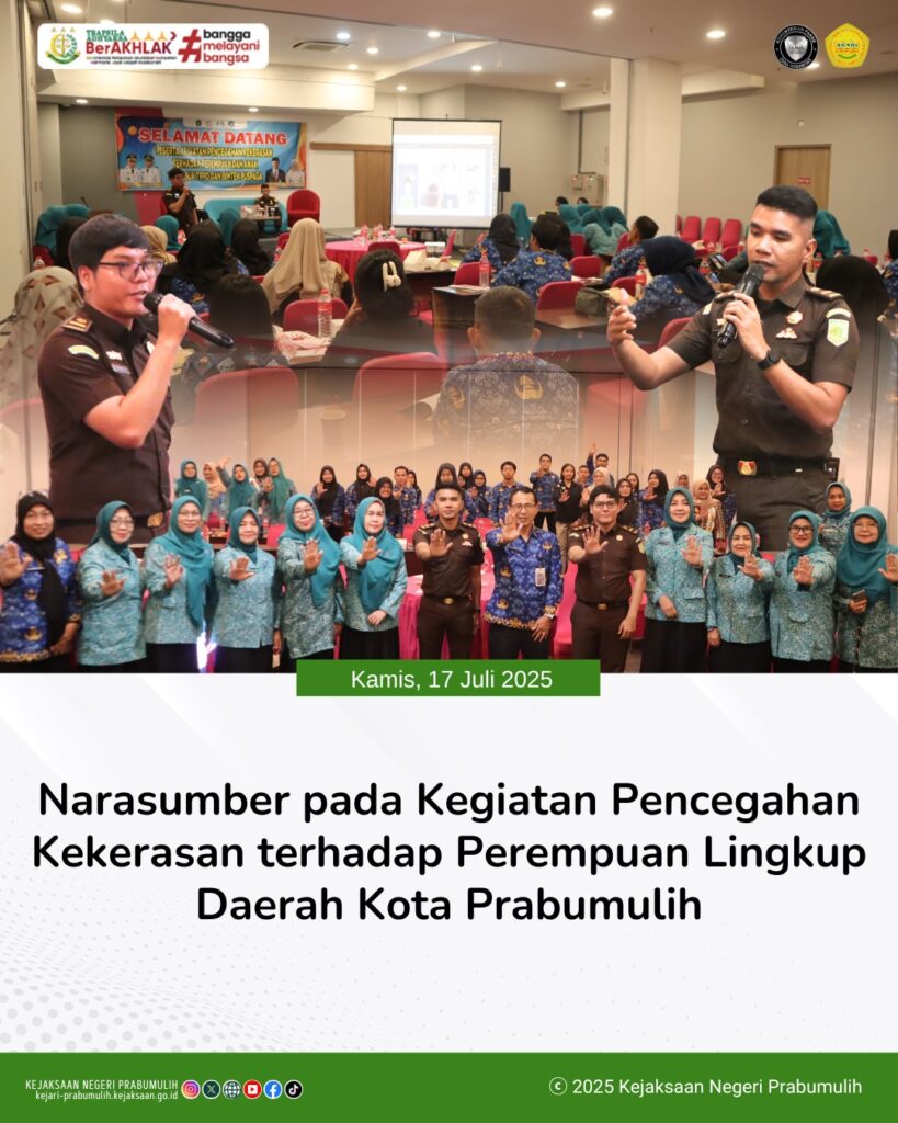 Bertempat di Fave Hotel Kota Prabumulih, Jaksa Fungsional pada Seksi Intelijen Bapak Rozza Syaputra, S.H. dan Bapak Afrialdi, S.H., menjadi Narasumber pada Kegiatan Pencegahan Kekerasan terhadap Perempuan Lingkup Daerah Kota Prabumulih yang dilaksanakan oleh Dinas PPKBPPA Kota Prabumulih.