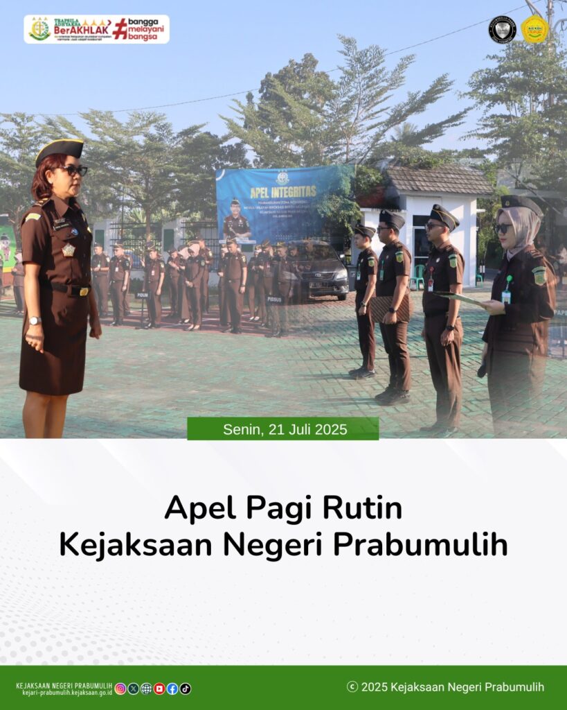 Bertempat di halaman Kantor Kejaksaan Negeri Prabumulih Kepala Seksi Perdata dan Tata Usaha Negara Ibu Erwina Mea Dimatnusa, S.H.,M.H., memimpin Apel Rutin Senin Pagi yang diikuti oleh Kasubsi dan Pegawai di lingkungan Kejaksaan Negeri Prabumulih.