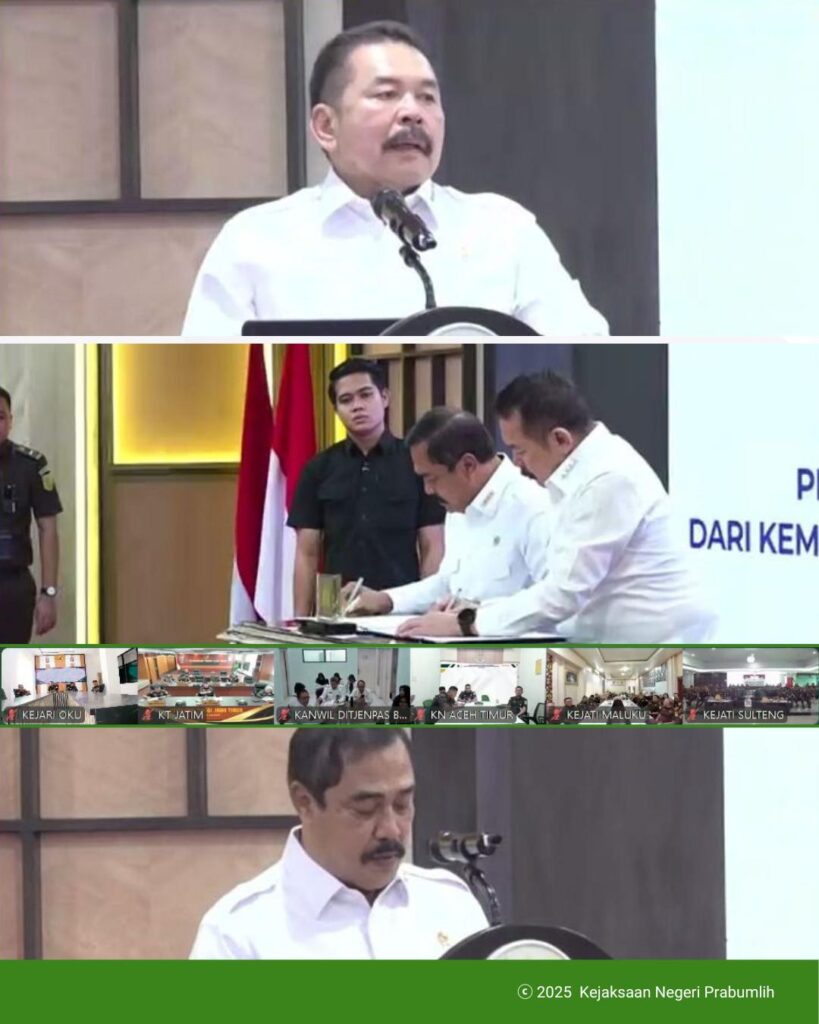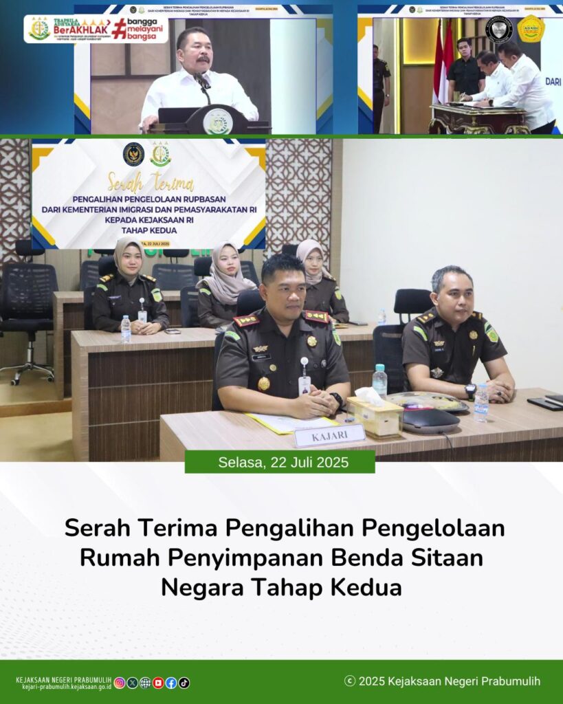 Kepala Kejaksaan Negeri Prabumulih Bapak Khristiya Lutfiasandhi, S.H., M.H. bersama Kepala Seksi PAPBB Bapak Faisyal Basni, S.H., M.H. mengikuti kegiatan Serah Terima Pengalihan Pengelolaan Rumah Penyimpanan Benda Sitaan Negara Tahap Kedua dari Kementrian Imigrasi dan Pemasyarakatan RI Kepada Kejaksaan RI yang dilakukan secara daring melalui zoom meeting.