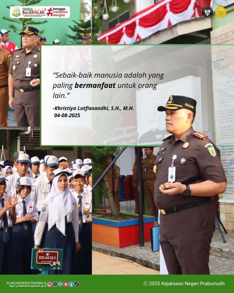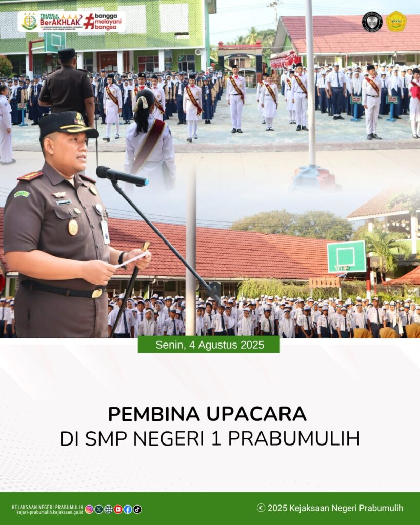 Bertempat di lapangan SMPN 1 Prabumulih Kepala Kejaksaan Negeri Prabumulih Bapak Khristiya Lutfiasandhi, S.H.,MH., didampingi Kepala Seksi Intelijen Bapak Ajie Martha, S.H., menjadi Pembina Upacara di SMP Negeri 1 Prabumulih yang diikuti Para guru dan seluruh siswa SMPN 1 Prabumulih.