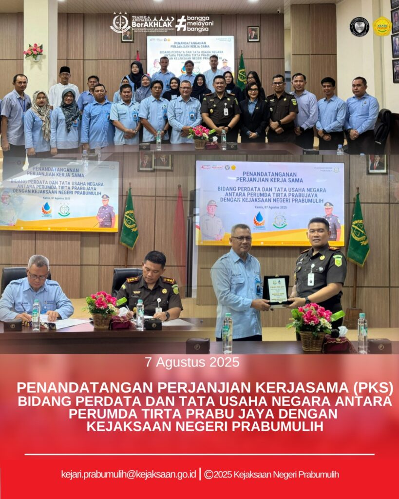 Bertempat di Kejaksaan Negeri Prabumulih, Kepala Kejaksaan Negeri Prabumulih, Khristiya Lutfiasandhi, S.H., M.H. didampingi Kepala Seksi Perdata dan Tata Usaha Negara, Erwina Mea Dimatnusa, S.H., M.H., melaksanakan penandatanganan Perjanjian Kerjasama (PKS) di Bidang Perdata dan Tata Usaha Negara antara Perumda Tirta Prabujaya dengan Kejaksaan Negeri Prabumulih.