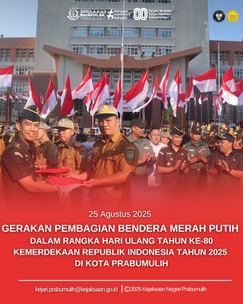 Bertempat di Lapangan Kantor Pemerintah Kota Prabumulih, Kepala Seksi Intelijen Bapak Ajie Martha, S.H., menghadiri Gerakan Pembagian Bendera Merah Putih dalam rangka Hari Ulang Tahun Ke-80 Kemerdekaam Republik Indonesia di Kota Prabumulih.