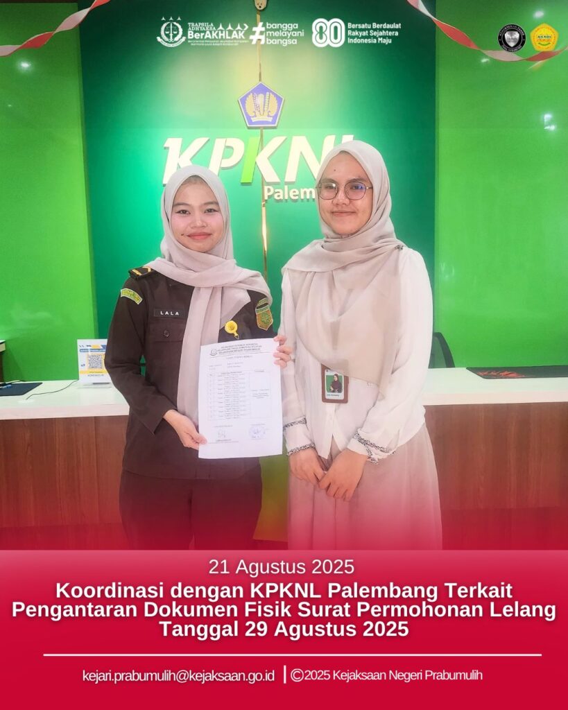 Kejari Prabumulih pada Bidang Pemulihan Aset dan Pengelolaan Barang Bukti (PAPBB) melaksanakan kegiatan koordinasi dengan KPKNL Palembang terkait pengantaran kelengkapan dokumen fisik pengajuan lelang yang akan dilaksanakan pada Jumat, tanggal 29 Agustus 2025 pukul 09.00 WIB (waktu server) di Kantor KPKNL Palembang.