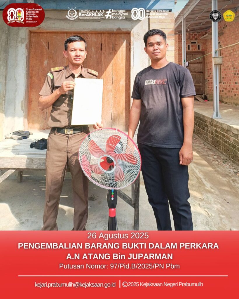 Kejari Prabumulih pada Bidang Pemulihan Aset dan Pengelolaan Barang Bukti (PAPBB) telah melaksanakan Pengembalian Barang Bukti Melalui Sistem Antar Barang Bukti (SANTRI) secara Gratis, berdasarkan Putusan PN Prabumulih Nomor: 97/Pid.B/2025/PN Pbm a.n. Terpidana Atang bin Juparman, berupa: