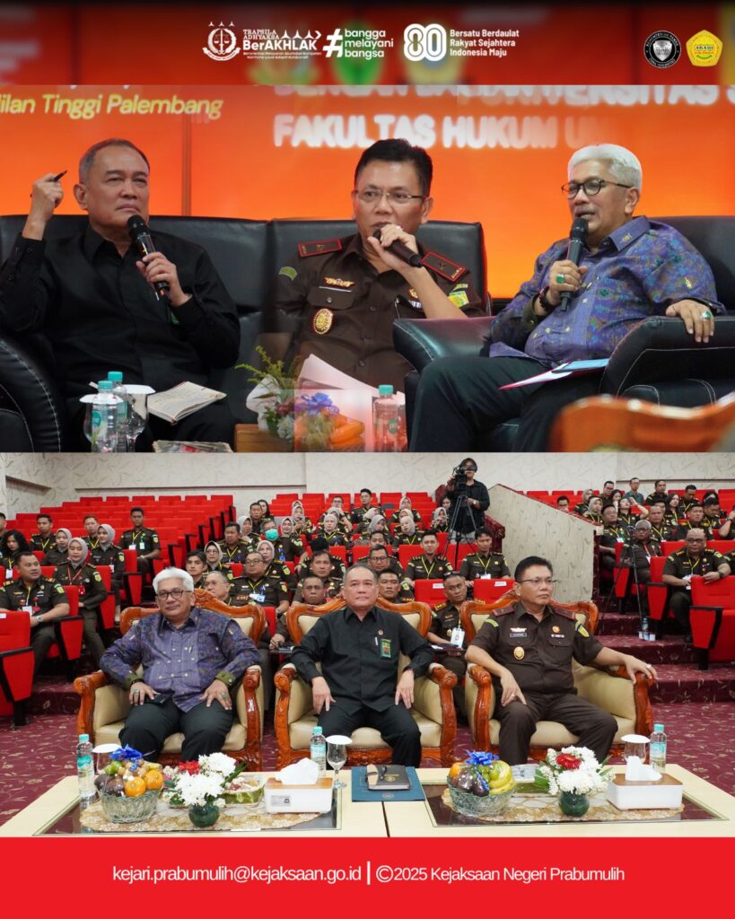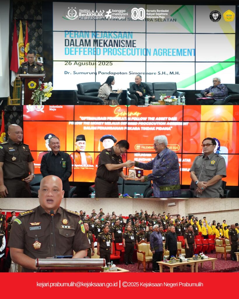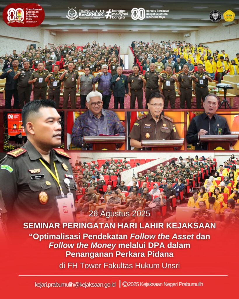 Bertempat di Amzulian Hall FH Tower Fakultas Hukum Universitas Sriwijaya, Kepala Kejaksaan Negeri Prabumulih Bapak Khristiya Lutfiasandhi, S.H., M.H. didampingi Kepala Seksi Tindak Pidana Umum Bapak Mirsyah Rizal, S.H., M.H. dan Kepala Seksi Tindak Pidana Khusus Bapak Safe’i, S.H., M.H. beserta Jaksa Fungsional dan Calon Jaksa Ahli Pertama menghadiri kegiatan Seminar Peringatan Hari Lahir Kejaksaan “Optimalisasi Pendekatan Follow the Asset dan Follow the Money melalui DPA dalam Penanganan Perkara Pidana”.