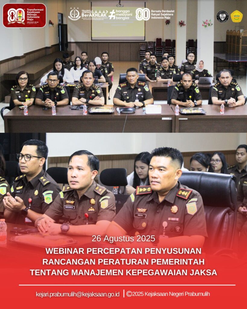 Bertempat di Aula Kejaksaan Negeri Prabumulih, Kepala Kejaksaan Negeri Prabumulih Bapak Khristiya Lutfiasandhi, S.H., M.H. didampingi para Kepala Seksi dan Jaksa Fungsional mengikuti kegiatan Webinar Percepatan Penyusunan Rancangan Peraturan Pemerintah Tentang Manajemen Kepegawaian Jaksa.
