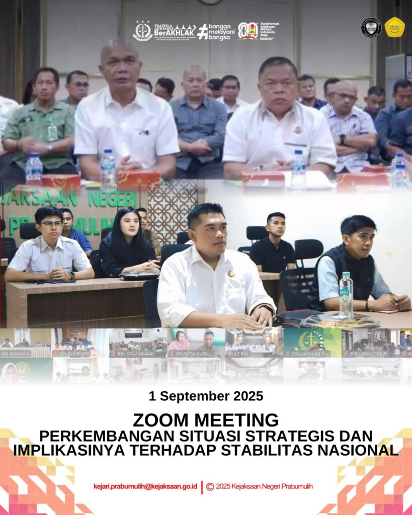 Kepala Kejaksaan Negeri Prabumulih Bapak Khristiya Lutfiasandhi, S.H.,MH., bersama Kepala Seksi Intelijen Bapak Ajie Martha, S.H., dan Kasubsi II Ibu Meylda Pegasari, S.H., serta staf Intelijen Kejaksaan Negeri Prabumulih mengikuti rapat Perkembangan Situasi dan Implikasinya Terhadap Stabilitas Nasional secara daring melalui zoom meeting.