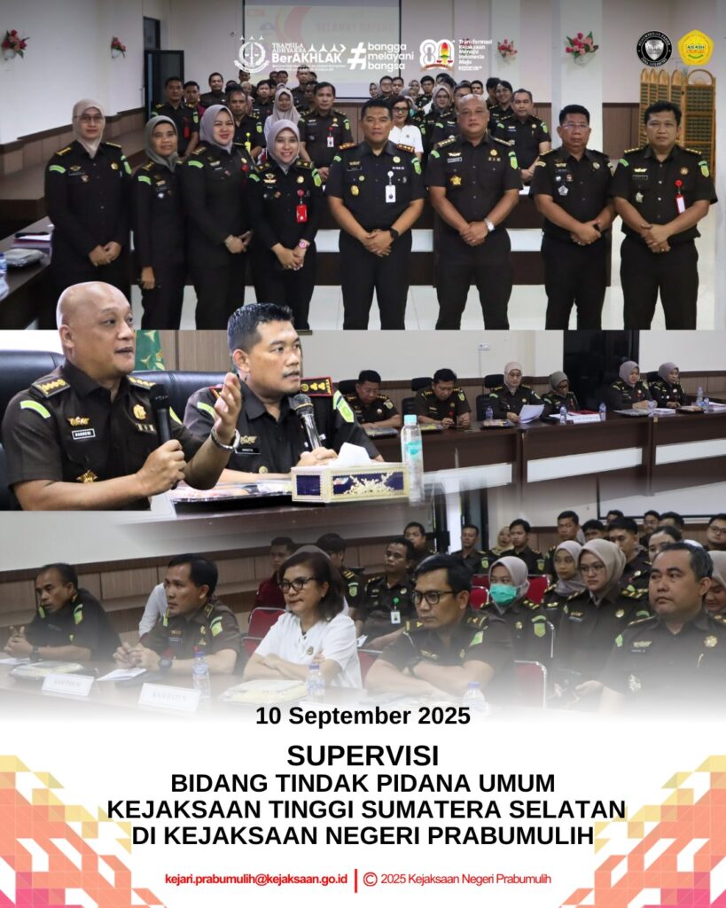 Kepala Kejaksaan Negeri Prabumulih Bapak Khristiya Lutfiasandhi, S.H., M.H., beserta Jajaran dan seluruh Pegawai Kejaksaan Negeri Prabumulih menyambut kedatangan Asisten Tindak Pidana Umum Kejaksaan Tinggi Sumatera Selatan beserta Tim dalam rangka Supervisi Bidang Tindak Pidana Umum Tahun 2025 pada Wilayah Hukum Kejaksaan Tinggi Sumatera Selatan di Kejaksaan Negeri Prabumulih.