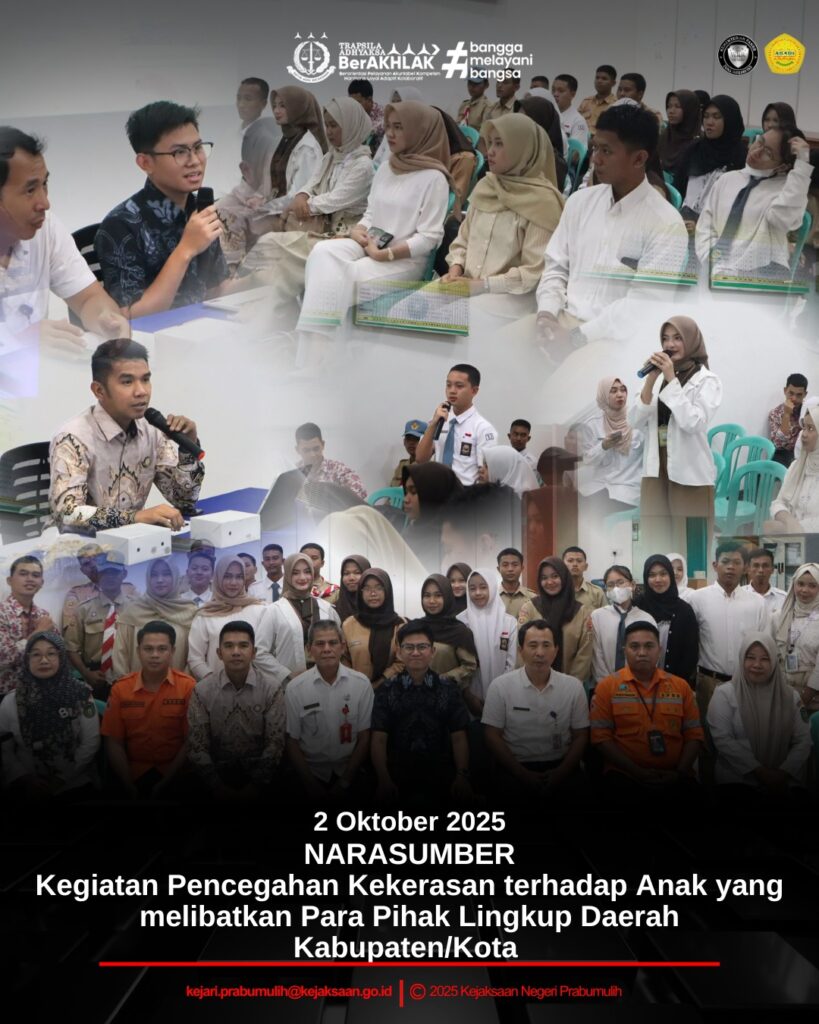 Bertempat di Ruang Rapat Sekretariat TP.PKK Kota Prabumulih, Jaksa Fungsional pada Seksi Intelijen Bapak Rozza Syaputra, S.H. dan Bapak Hendro Adi S, S.H., menjadi Narasumber pada Kegiatan Pencegahan Kekerasan terhadap Anak yang Melibatkan Para Pihak Lingkup Daerah Kabupaten/Kota Sub Kegiatan Advokasi dan Pendampingan Perangkat Daerah dalam Pelaksanaan Kebijakan/Program/Kegiatan Pencegahan KTA Kota Prabumulih Tahun 2025.
